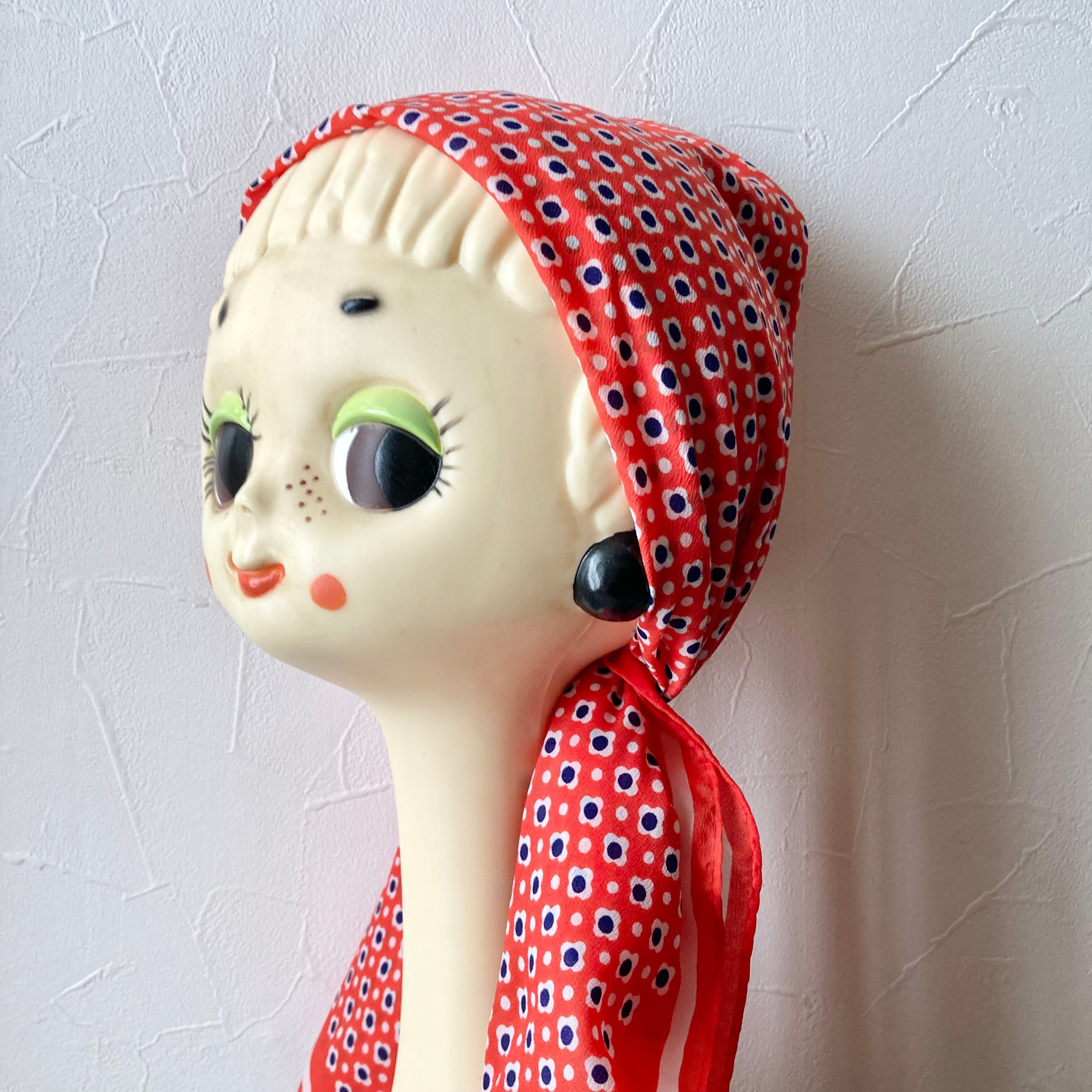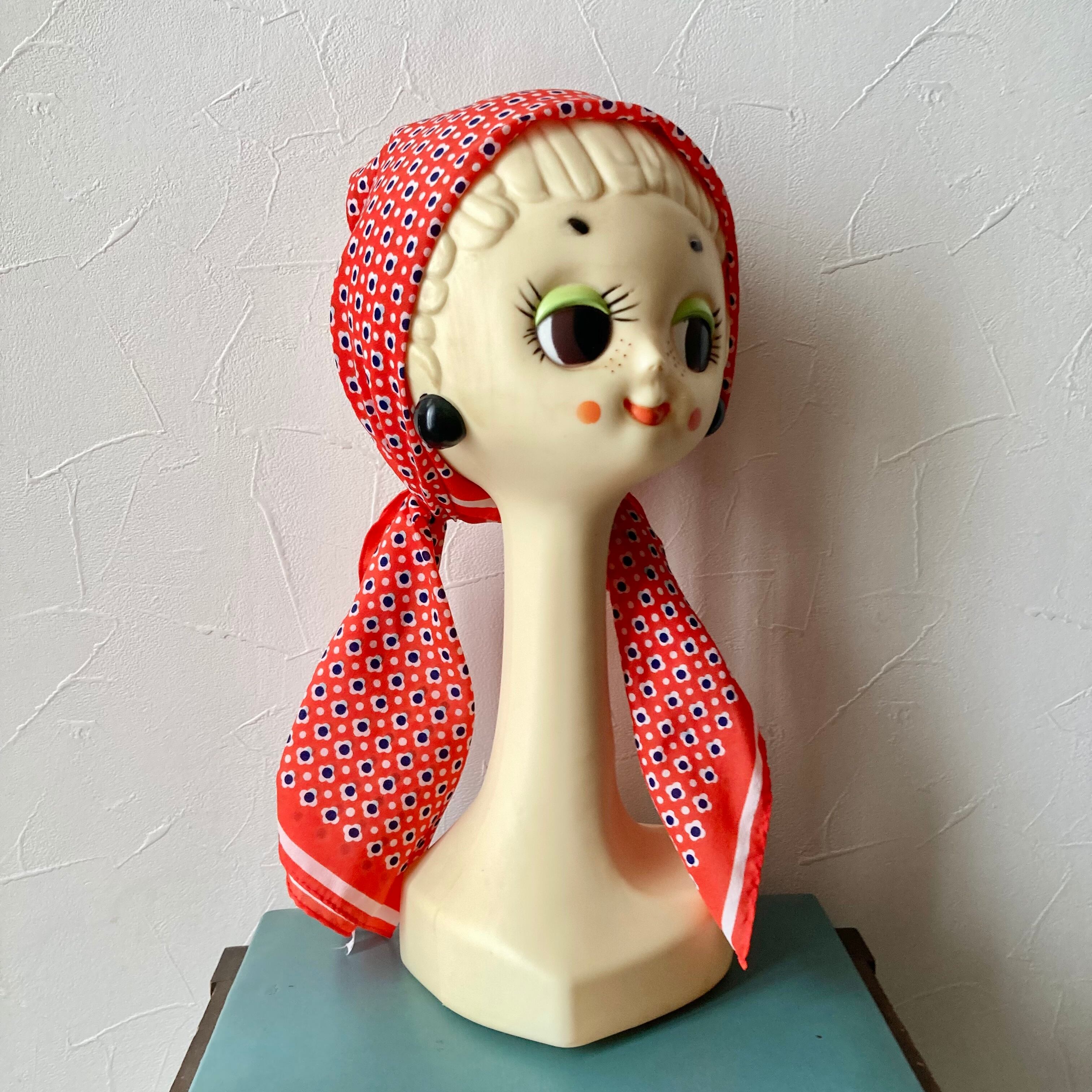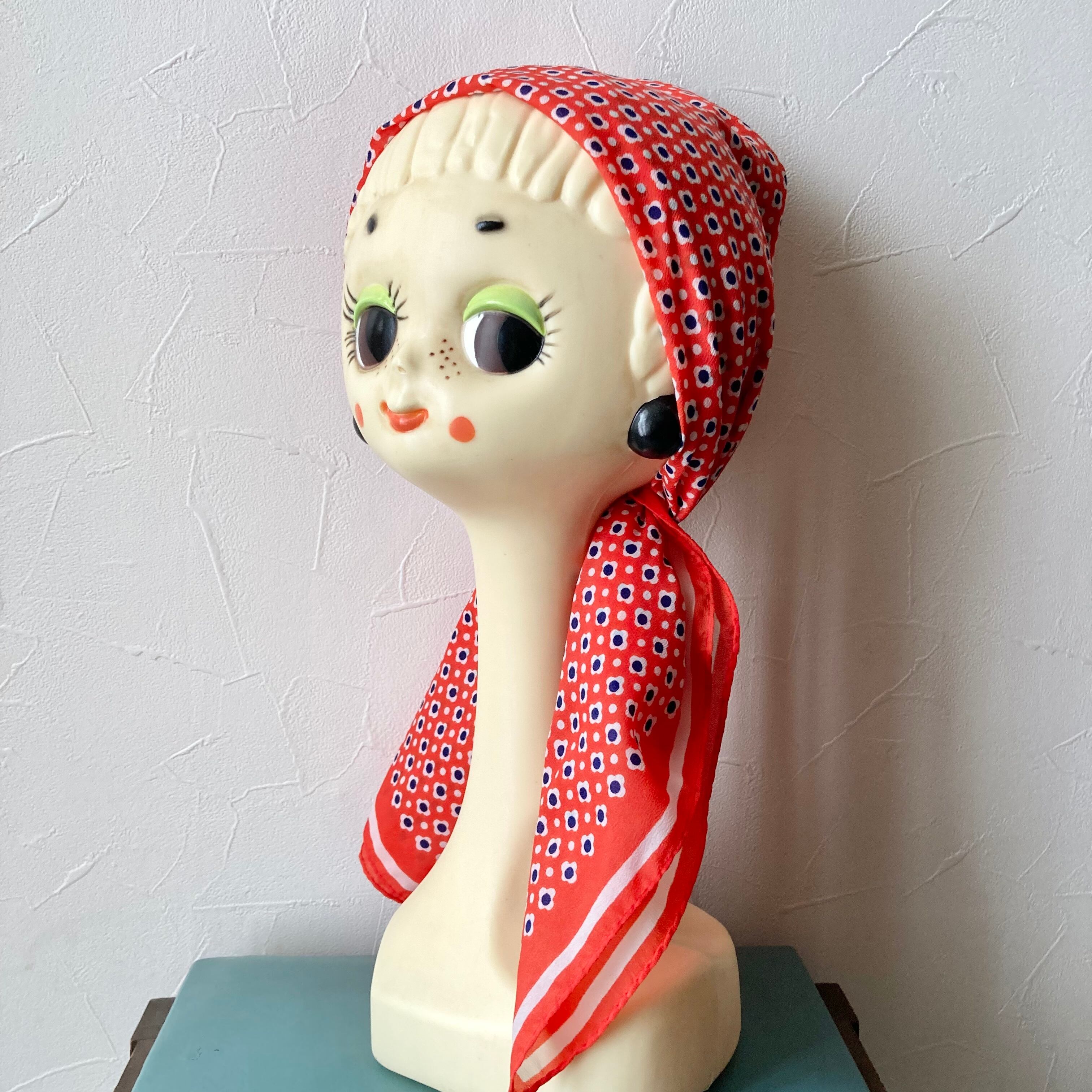 朱色にポップな白×ネイビーの小さなお花模様がレトロで可愛い大きめなスカーフです◯
