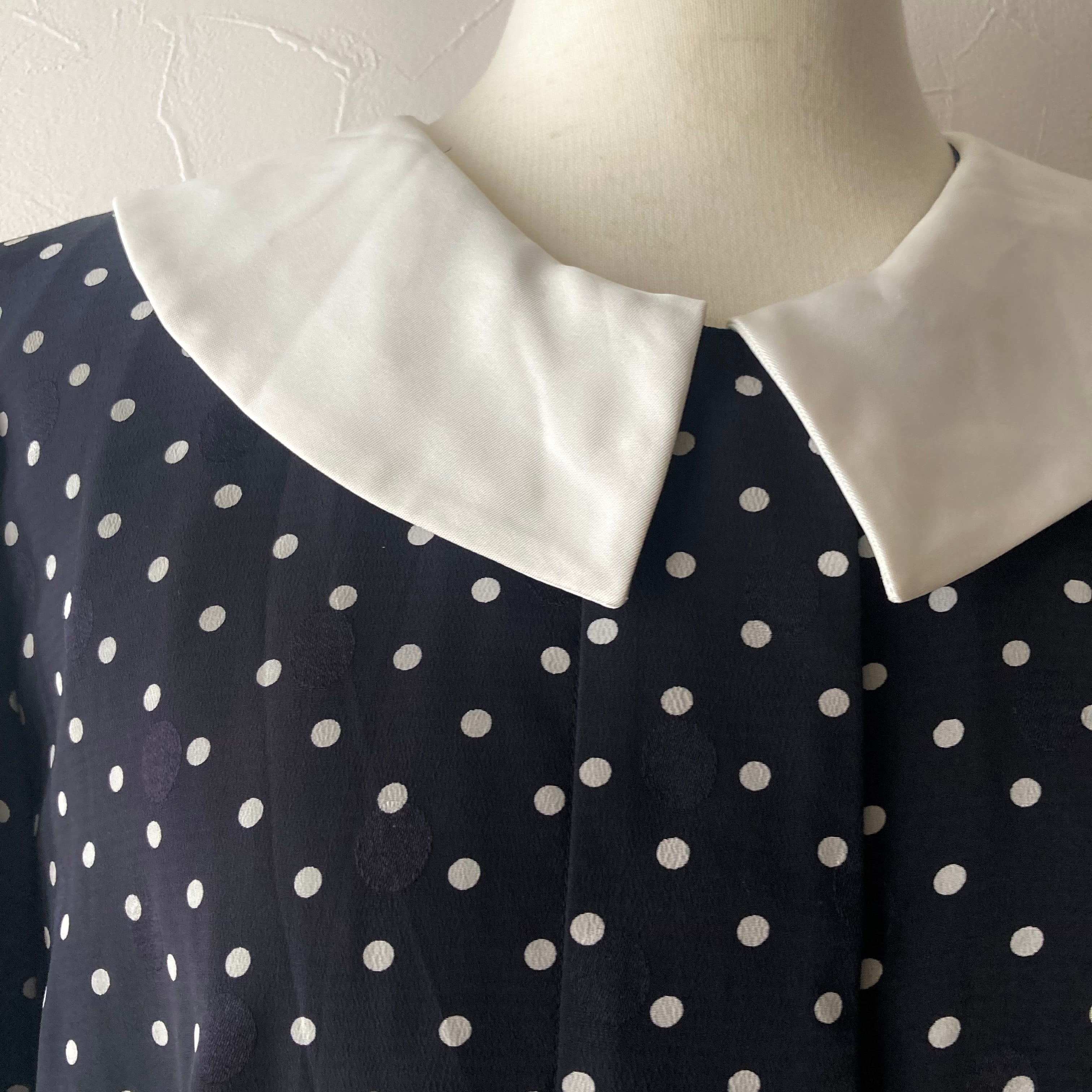 黒地に水玉模様が入ったホワイトの襟が可愛らしいワンピース◯ よく見ると生地にも白色とは違う大きさの水玉入っていておしゃれ♡ホワイトの切り替えの袖先に黒のボタンもレトロで可愛いデザイン。8部袖くらいの丈感、ストンとしたシルエットも可愛いです。