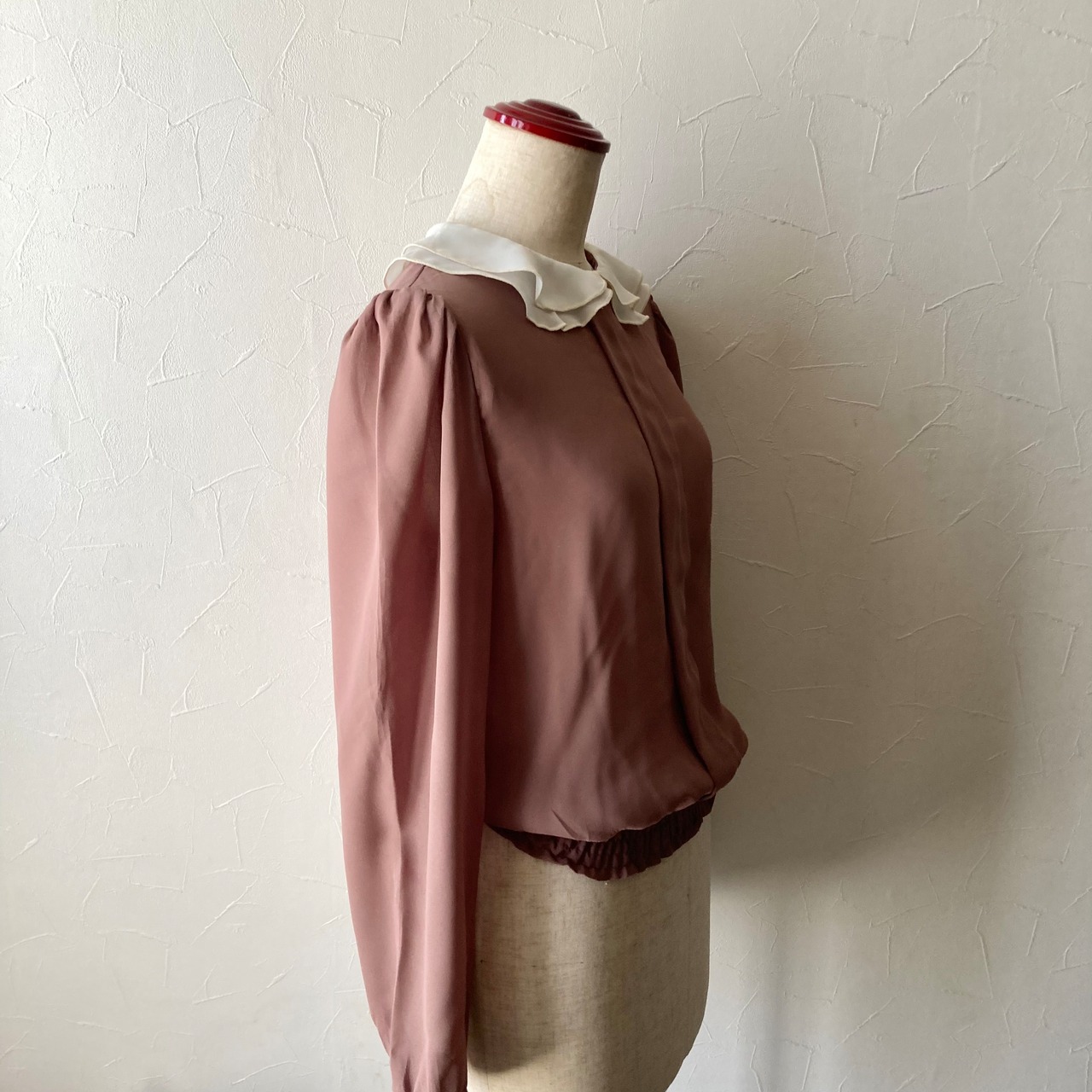 ひらひらと繊細な二重襟に肩のギャザーが効いた袖、シンプルの中に上品さとフェミニンさが合わさったレトロなブラウスです。