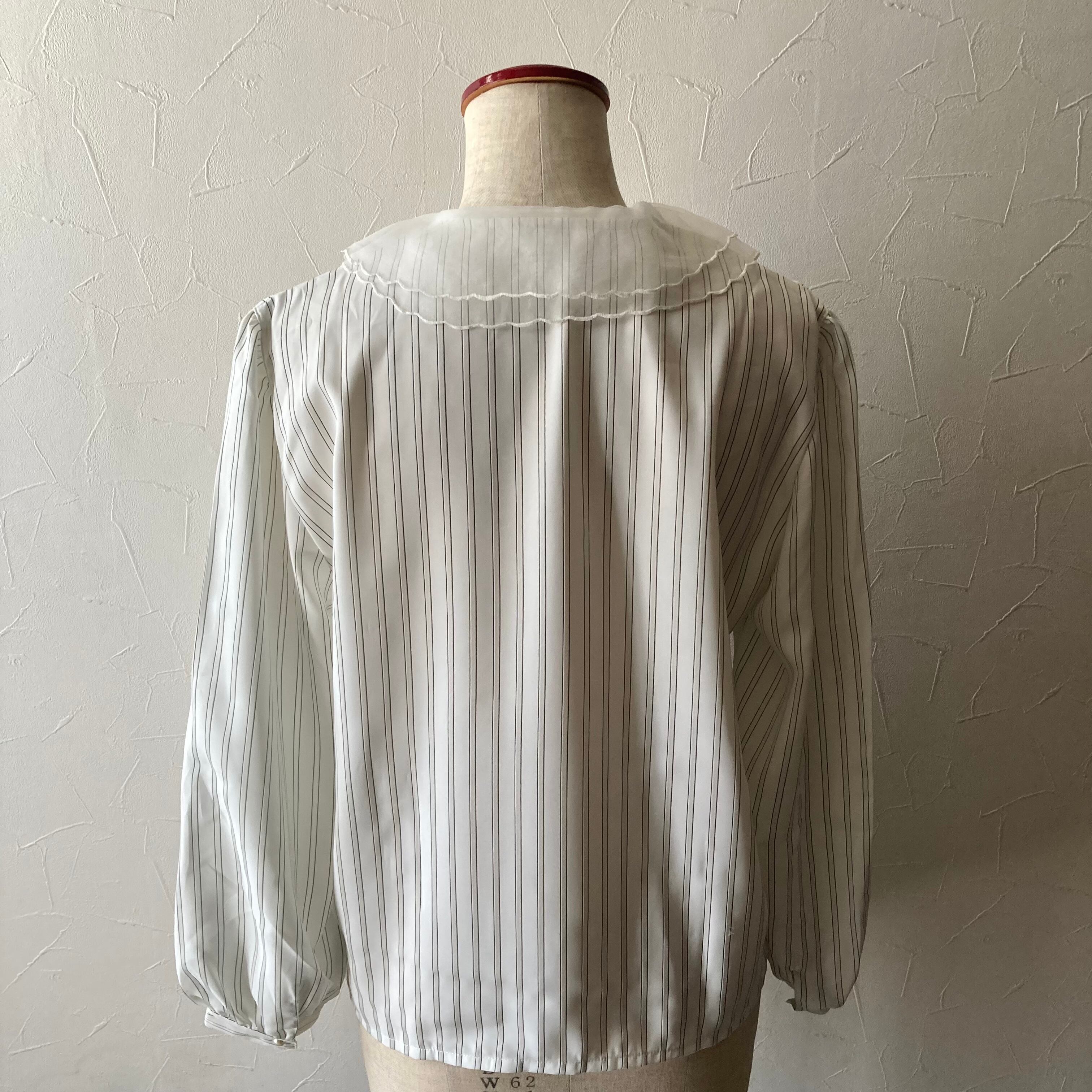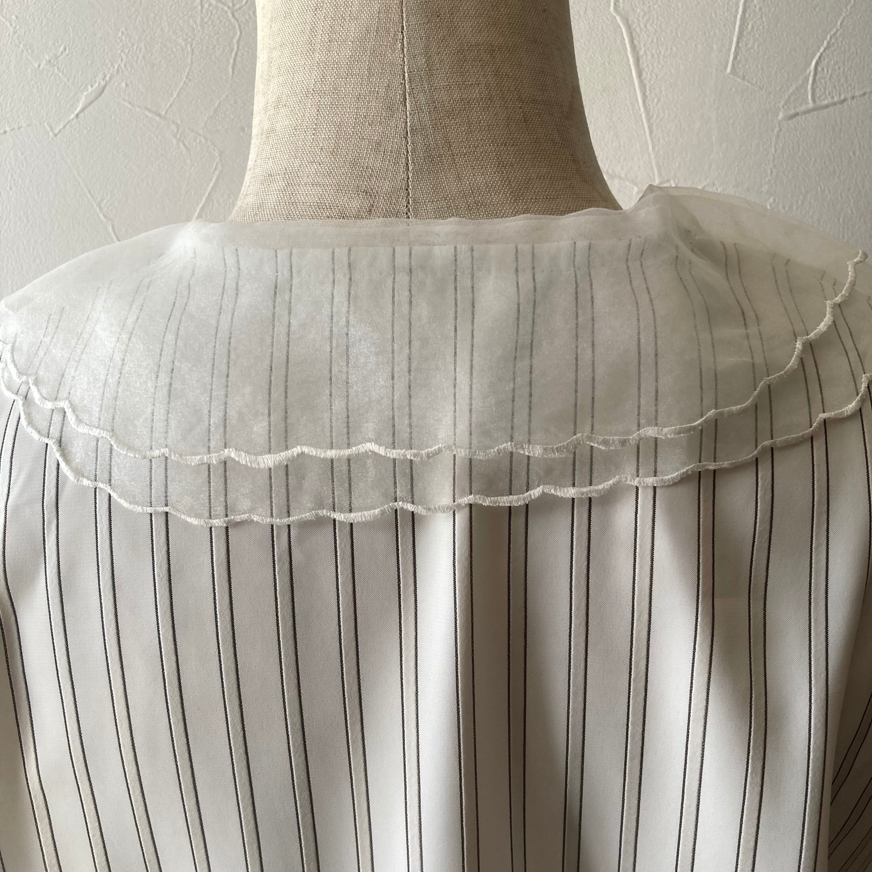 スカラップのシアーレースの二重襟やパールボタン、シルバーのようなライトグレーのようなストライプがおしゃれなレトロ上品なブラウス◯