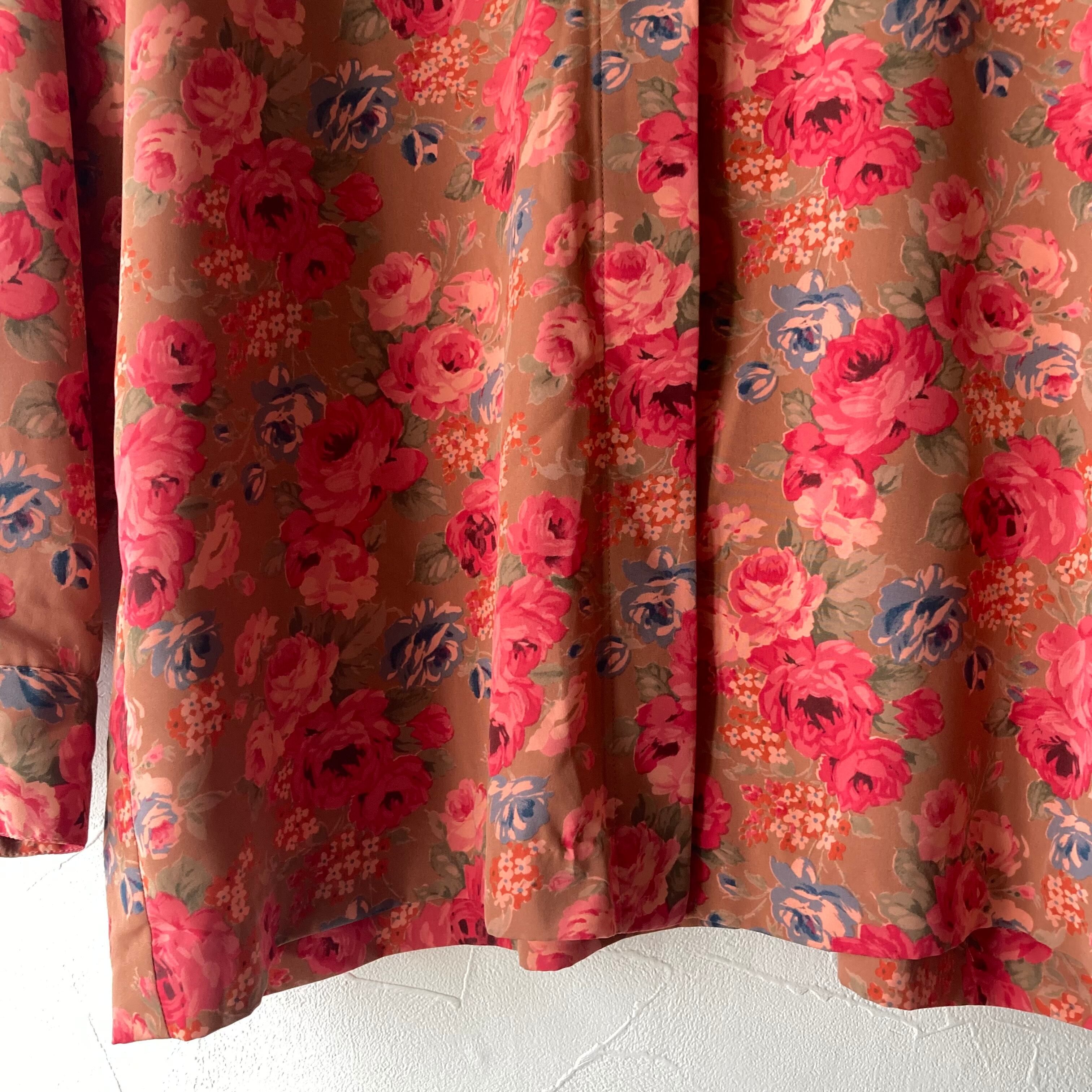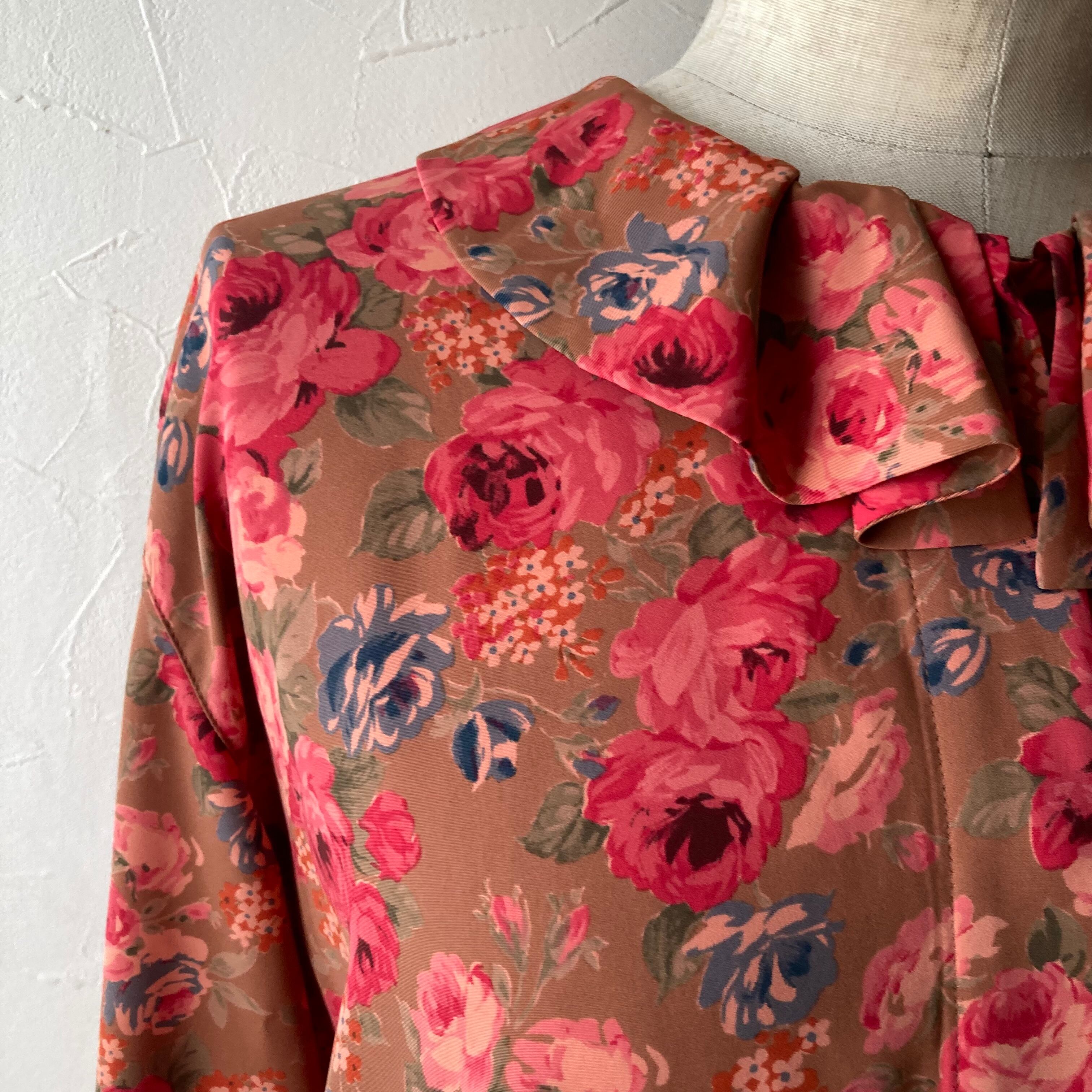 ライトブラウンに濃いピンクとブルーの花が美しいレトロブラウス◯ひらひらとした襟も可愛らしいです。少しゆったり感のあるサイズなので、ちょっぴりルーズな雰囲気で、エレガントな花柄も可愛らしい印象に。