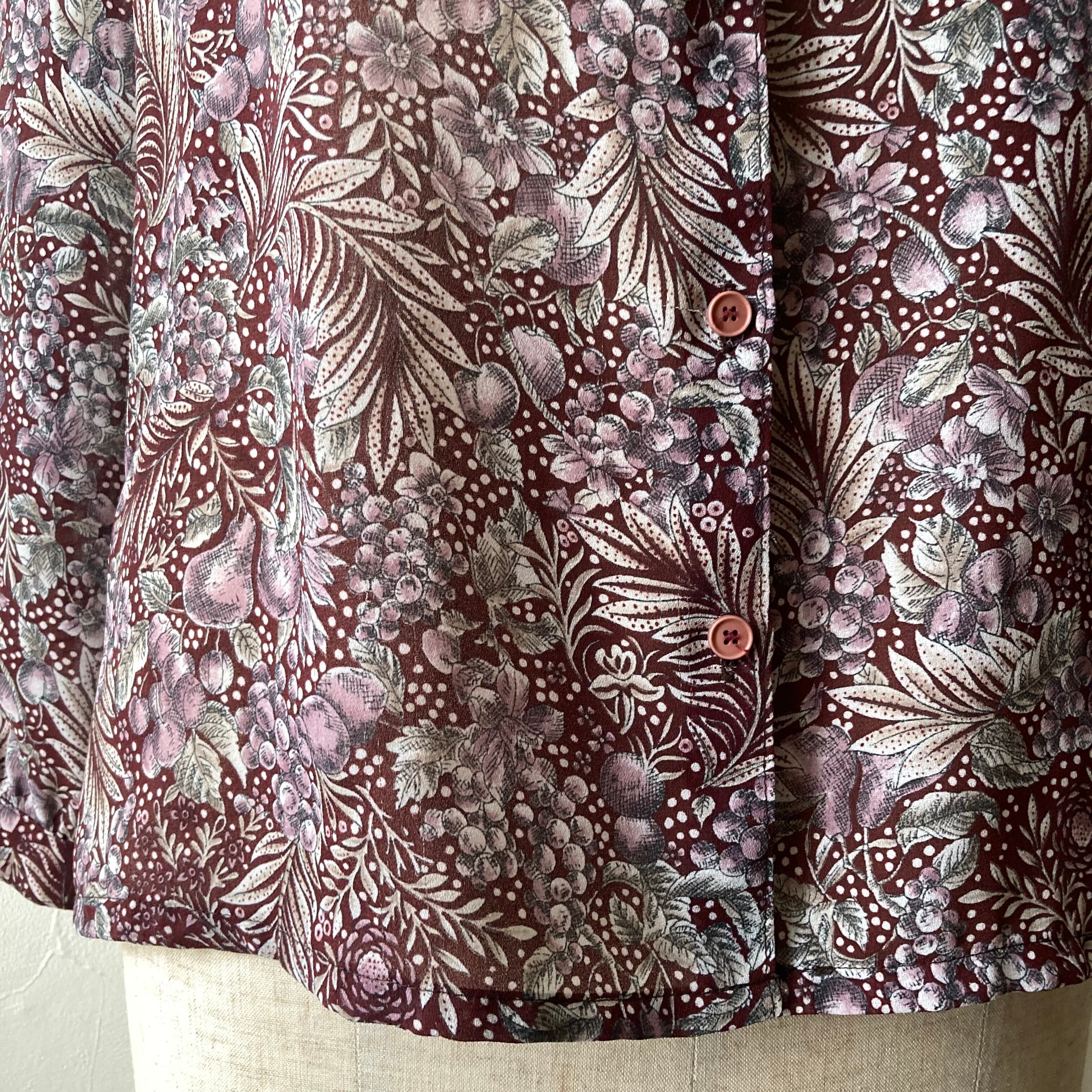 落ち着いたあずき色に白のドットがゆらゆらと、その中に花や実がたわわと揺れている、よく見ると素敵なイラストのレトロなブラウスです。