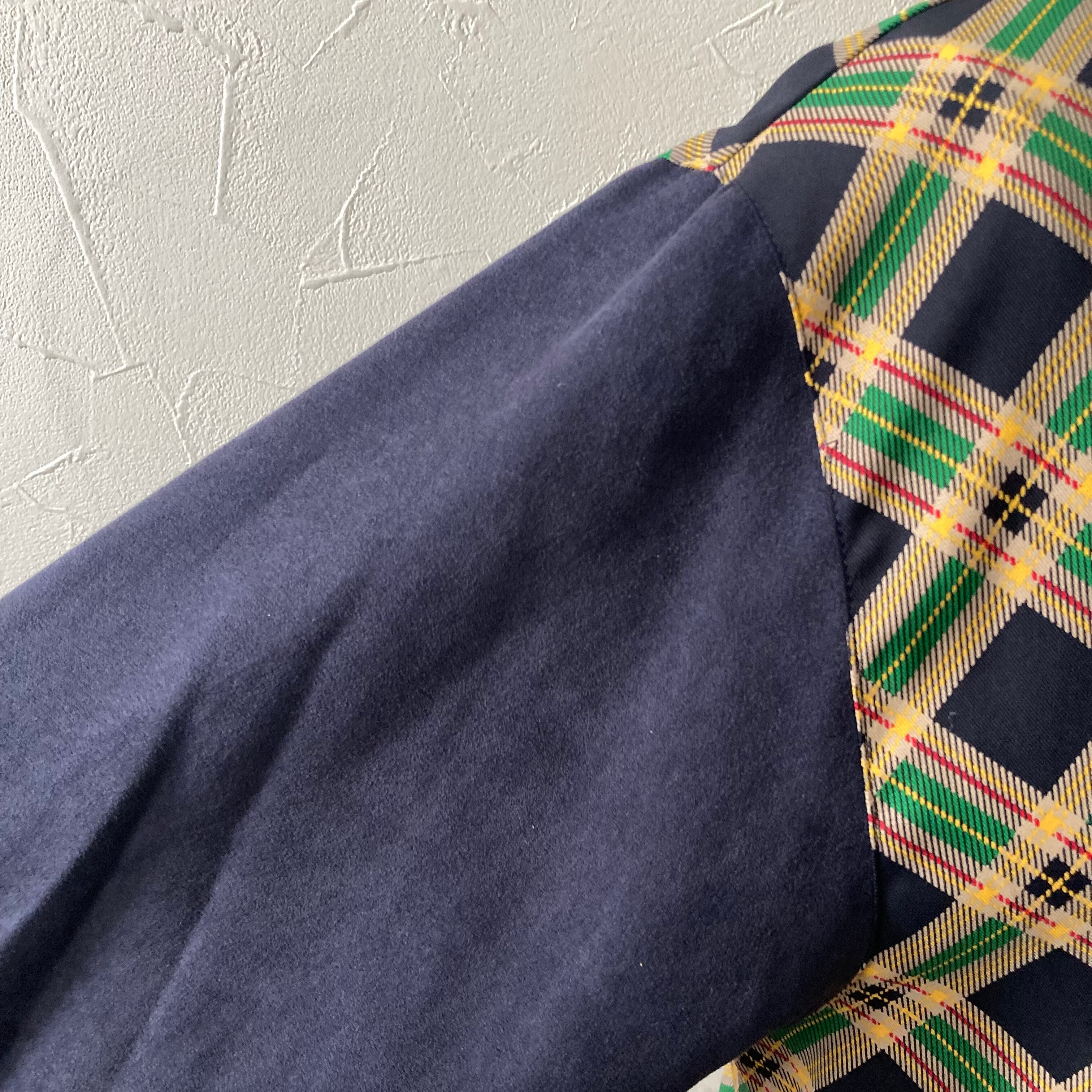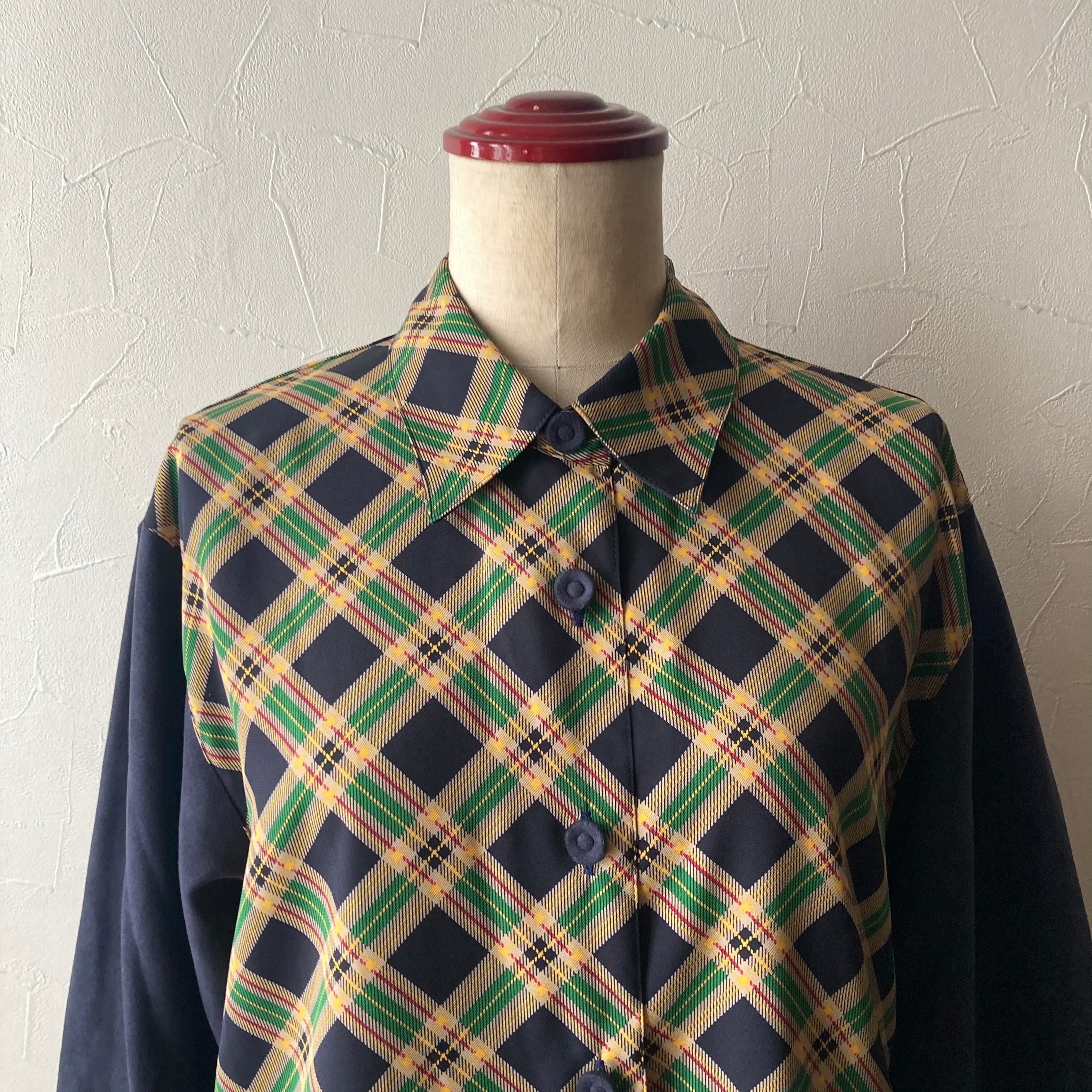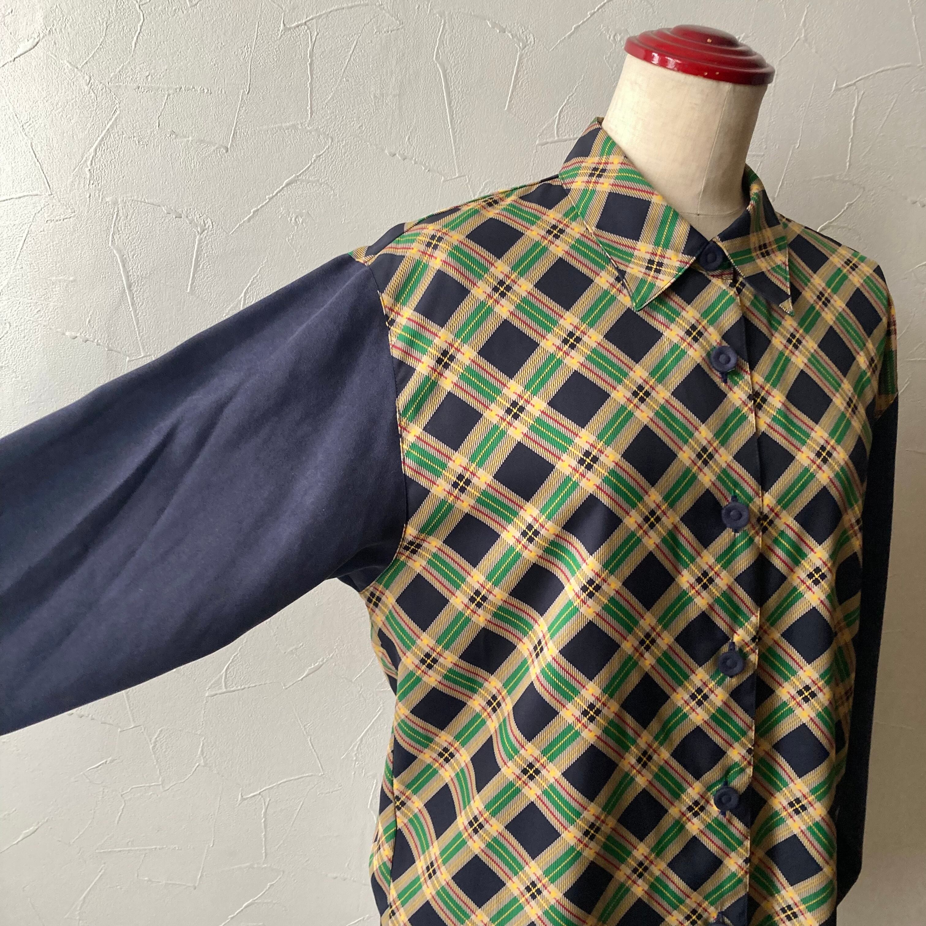 ネイビーに黄色と緑と赤のタータンチェックがレトロ90s風ブラウス。袖は異素材になっています。きっちりとしたチェック柄ですが、少しゆったりめのサイズ感なのでゆるく可愛く着ていただけると思います。