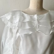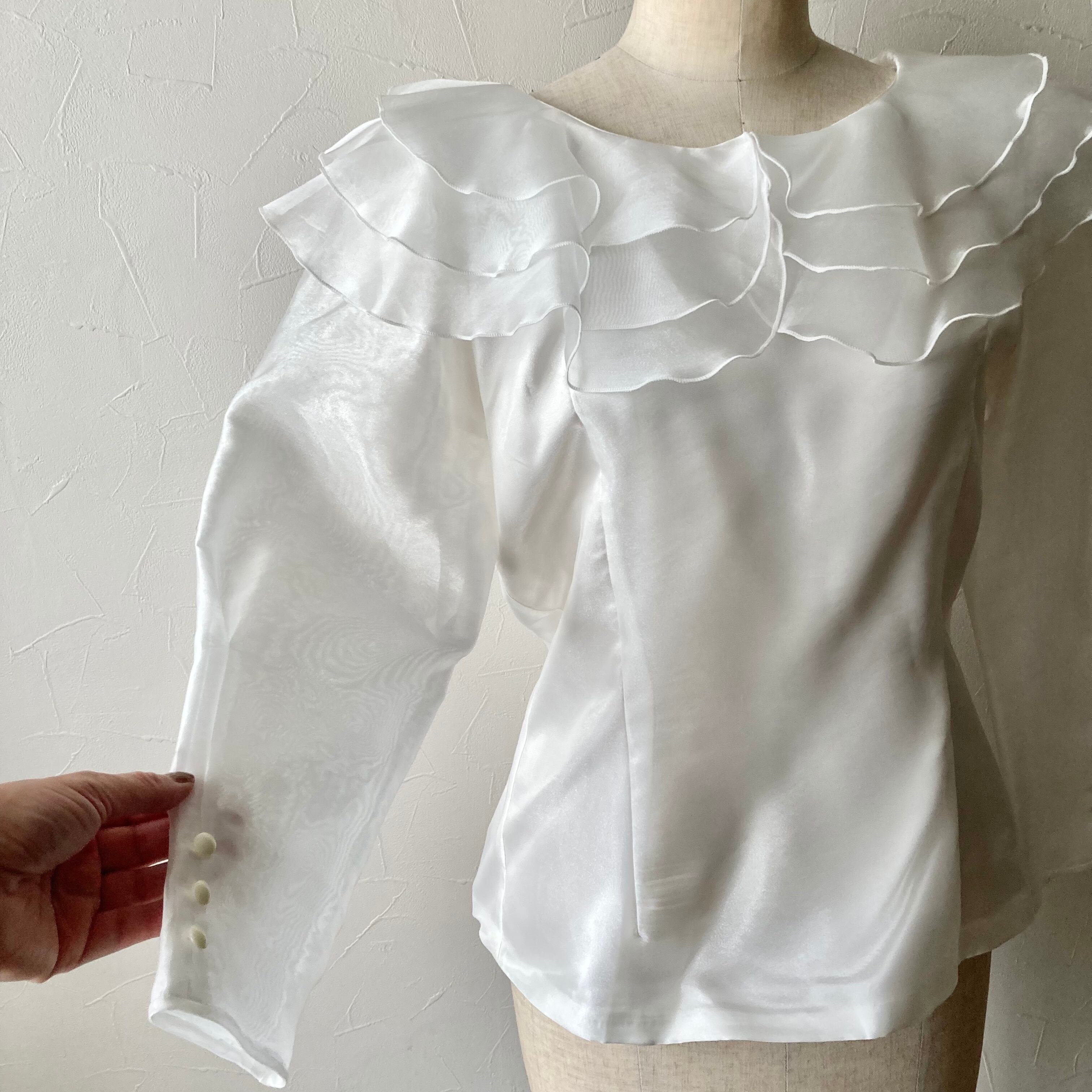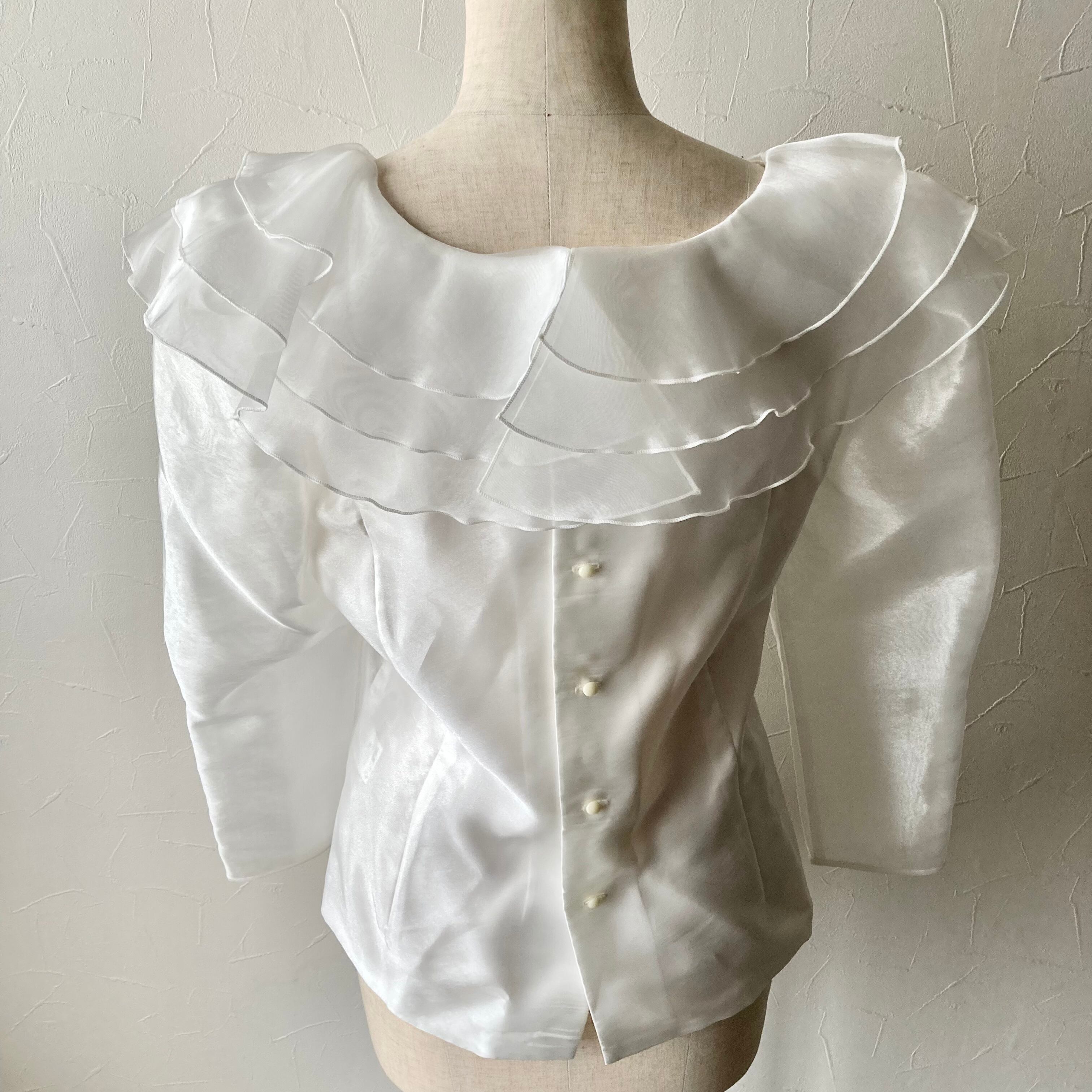 光沢のあるウエディングドレスのような上品な素材のトップスです。袖に透け感があります。ひらひらと大きいシースルー襟がステキです。ウエストはゆるくくびれがあるデザインでシルエットもとてもきれいです。パーティやお祝いの席に個性的でおしゃれなレトロコーデはいかがでしょうか。