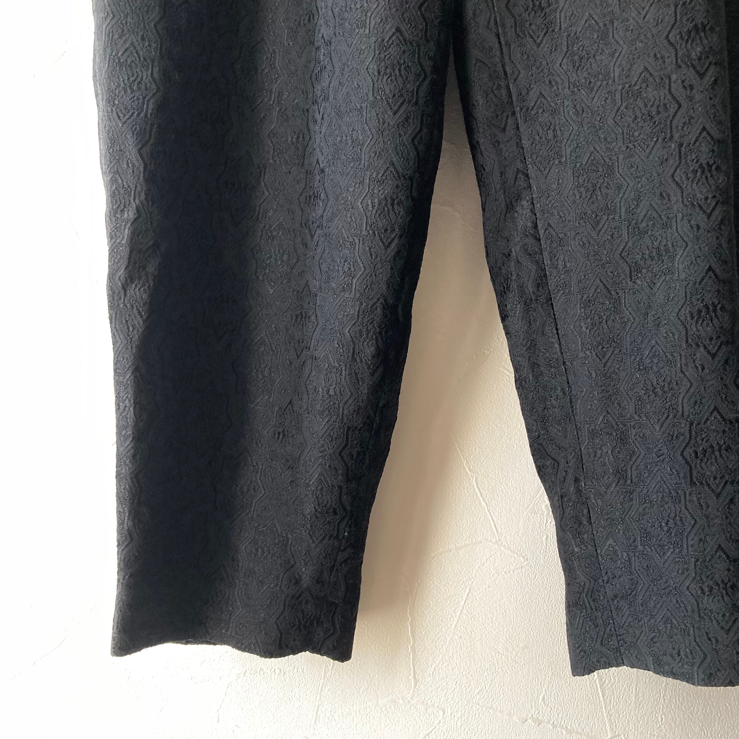 ウエストにたっぷり入ったギャザーでお尻周りはふんわりゆったり、裾に向けて細くなったきれいなシルエットのデザインです。刺繍の入った素材がとってもすてきで、一味違った古着らしいおしゃれパンツでお出かけも楽しくなっちゃいます。