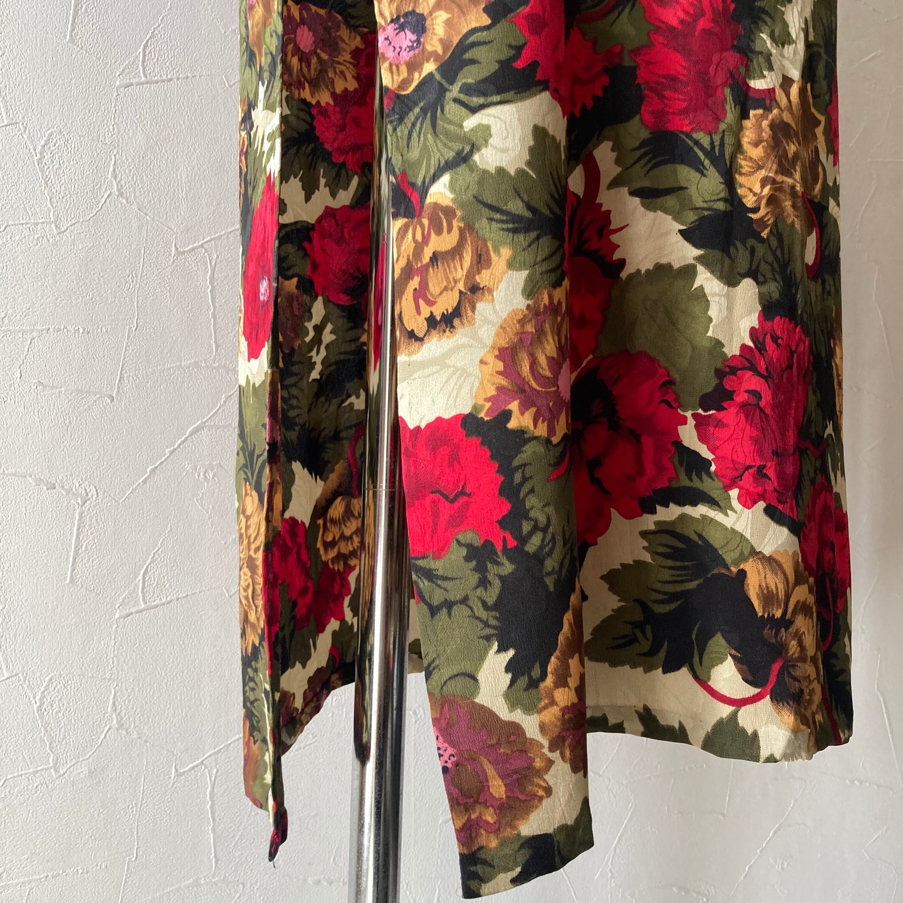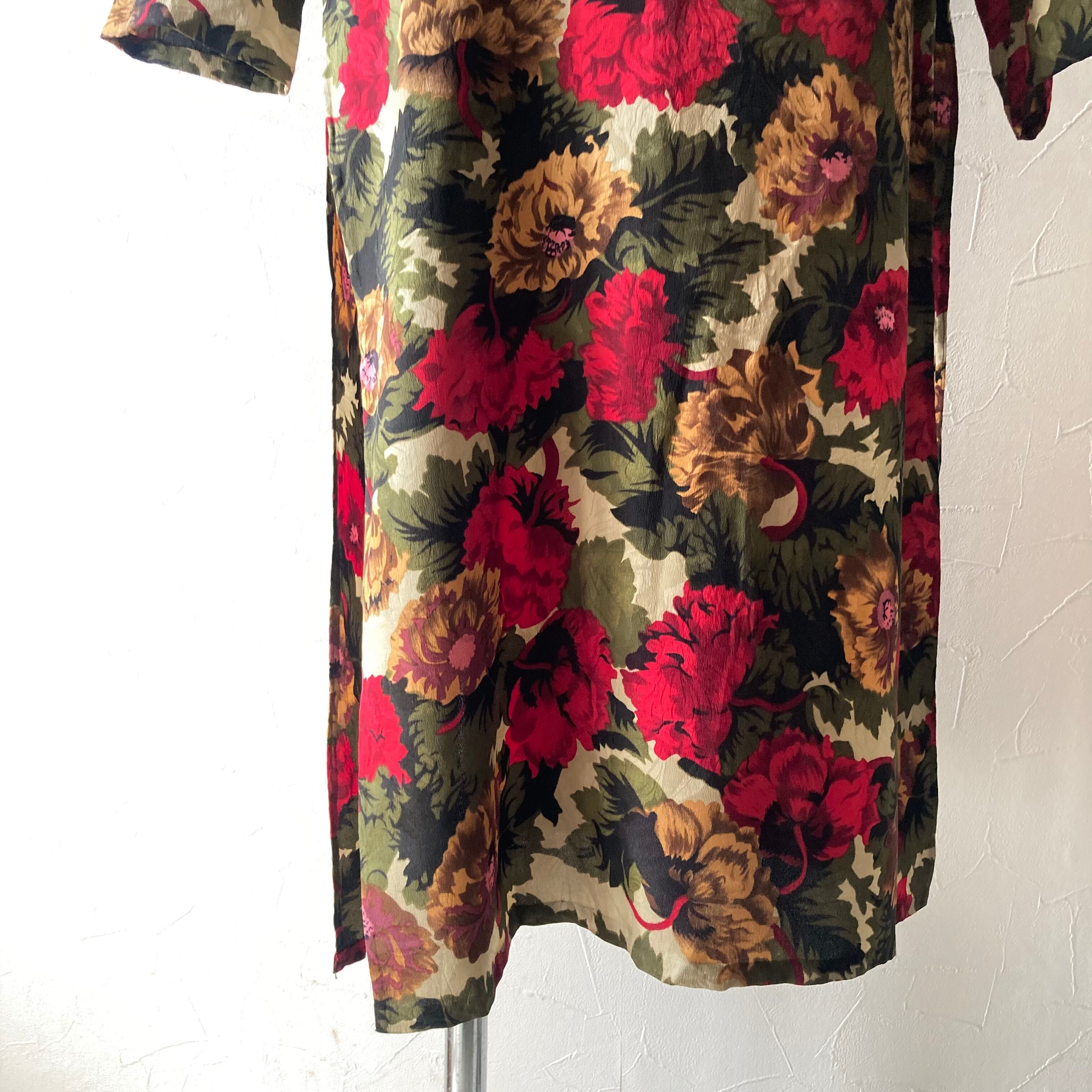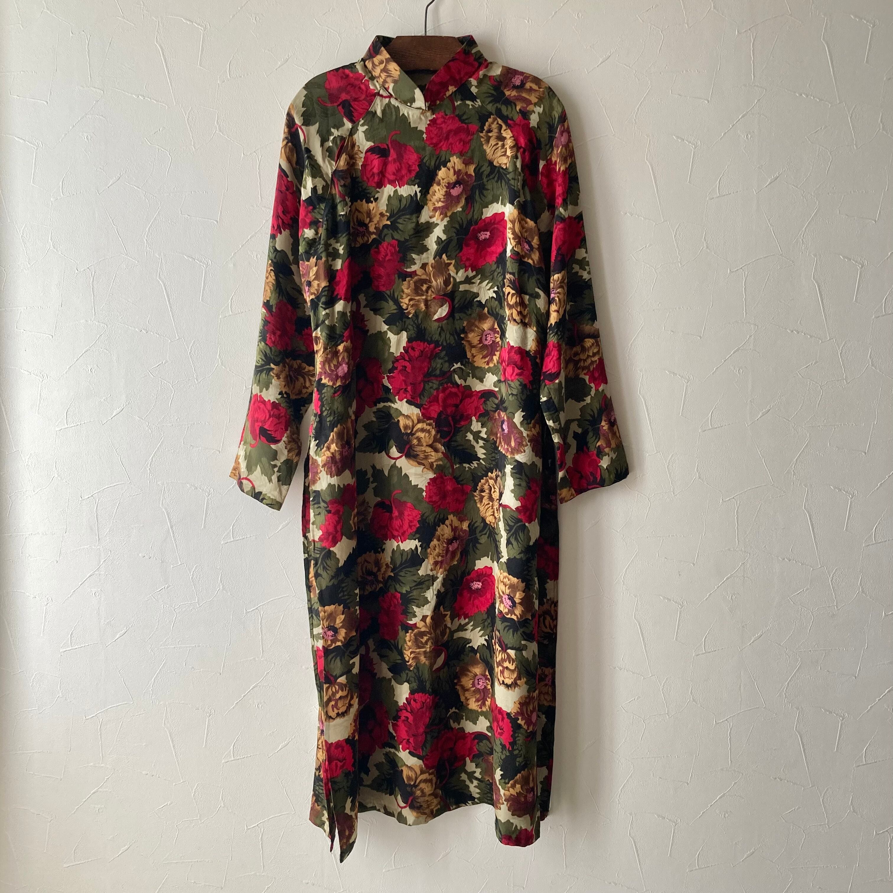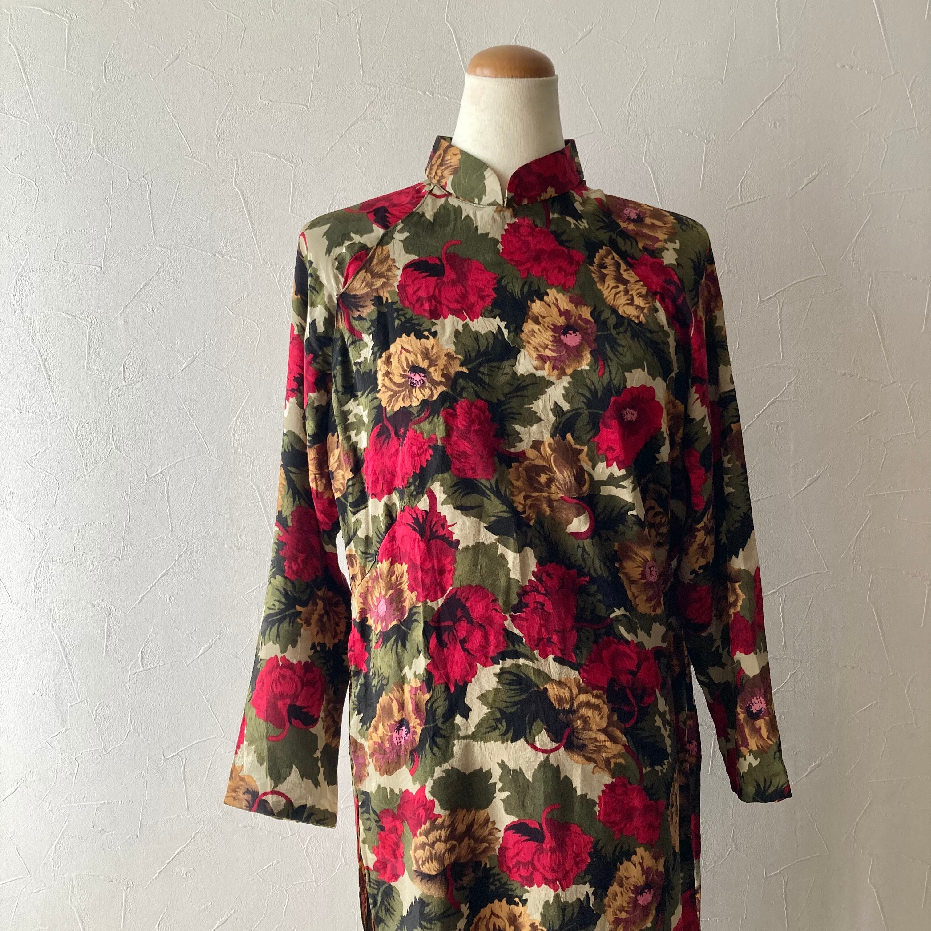 エレガントで華やかな花模様のチャイナ風ワンピース。両サイドにスリットが入っているのでパンツやロングスカートに合わせて。シルクのような繊細な素材が上品です。