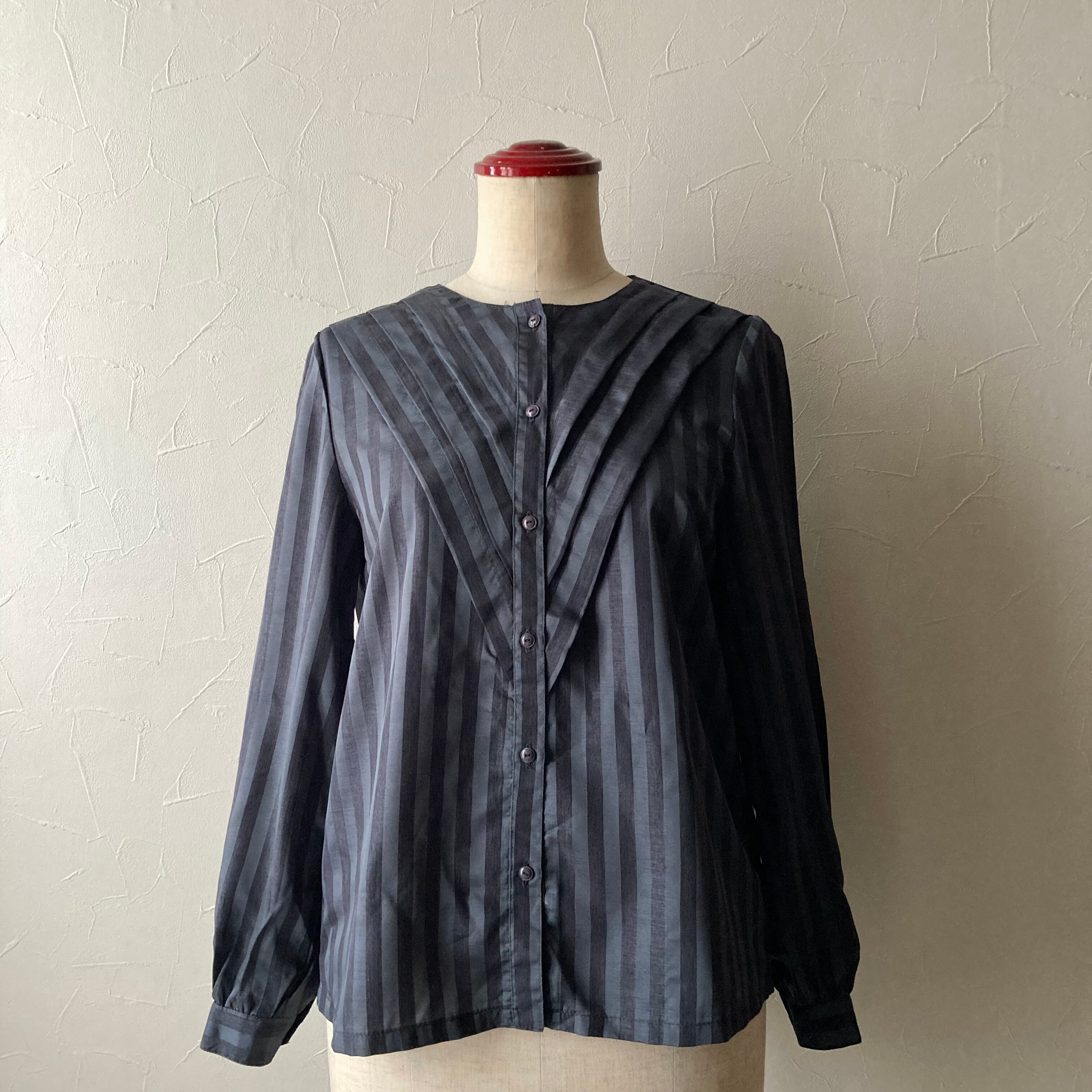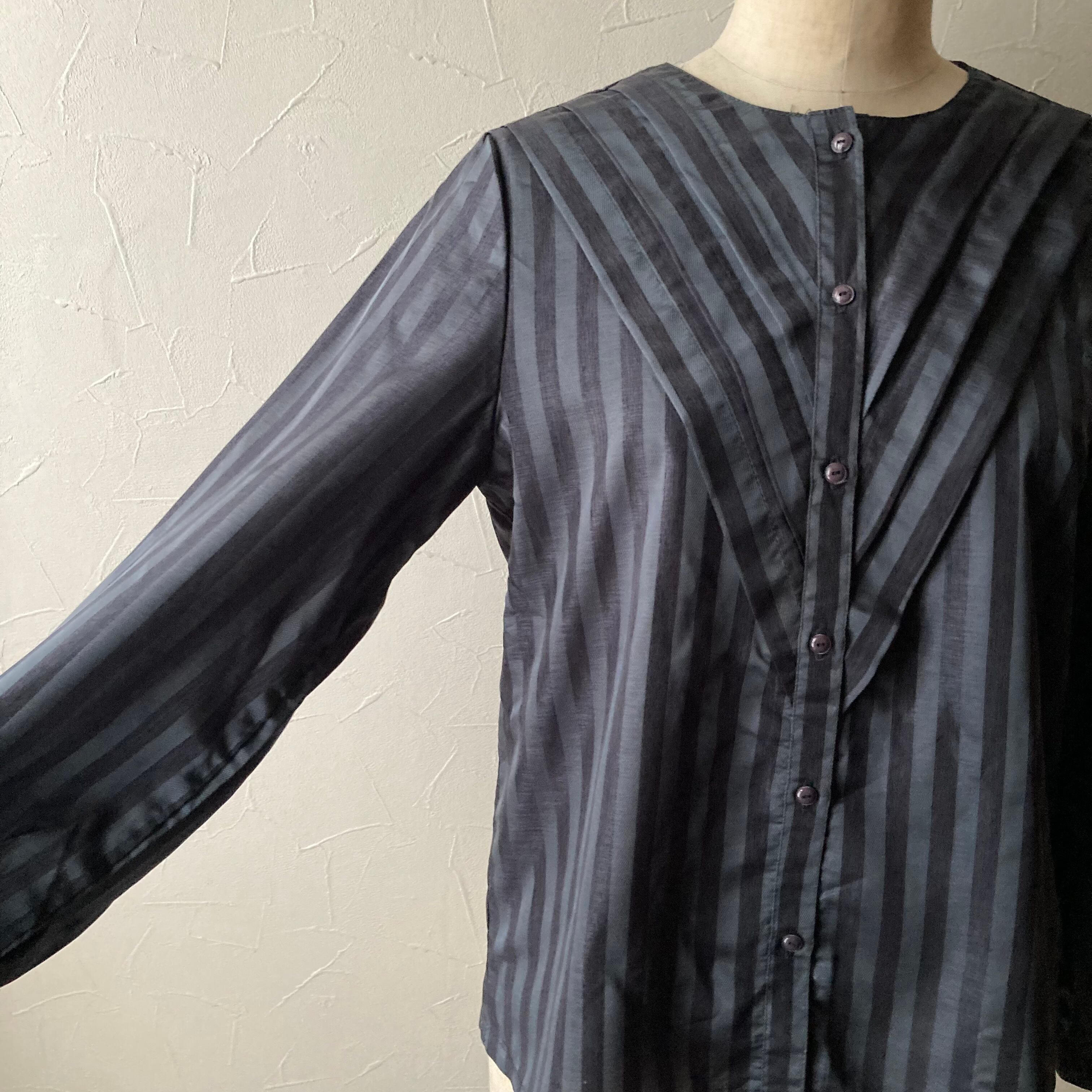 モノトーンのストライプ柄のノーカラーブラウス◯ Vのプリーツデザインがステキです。