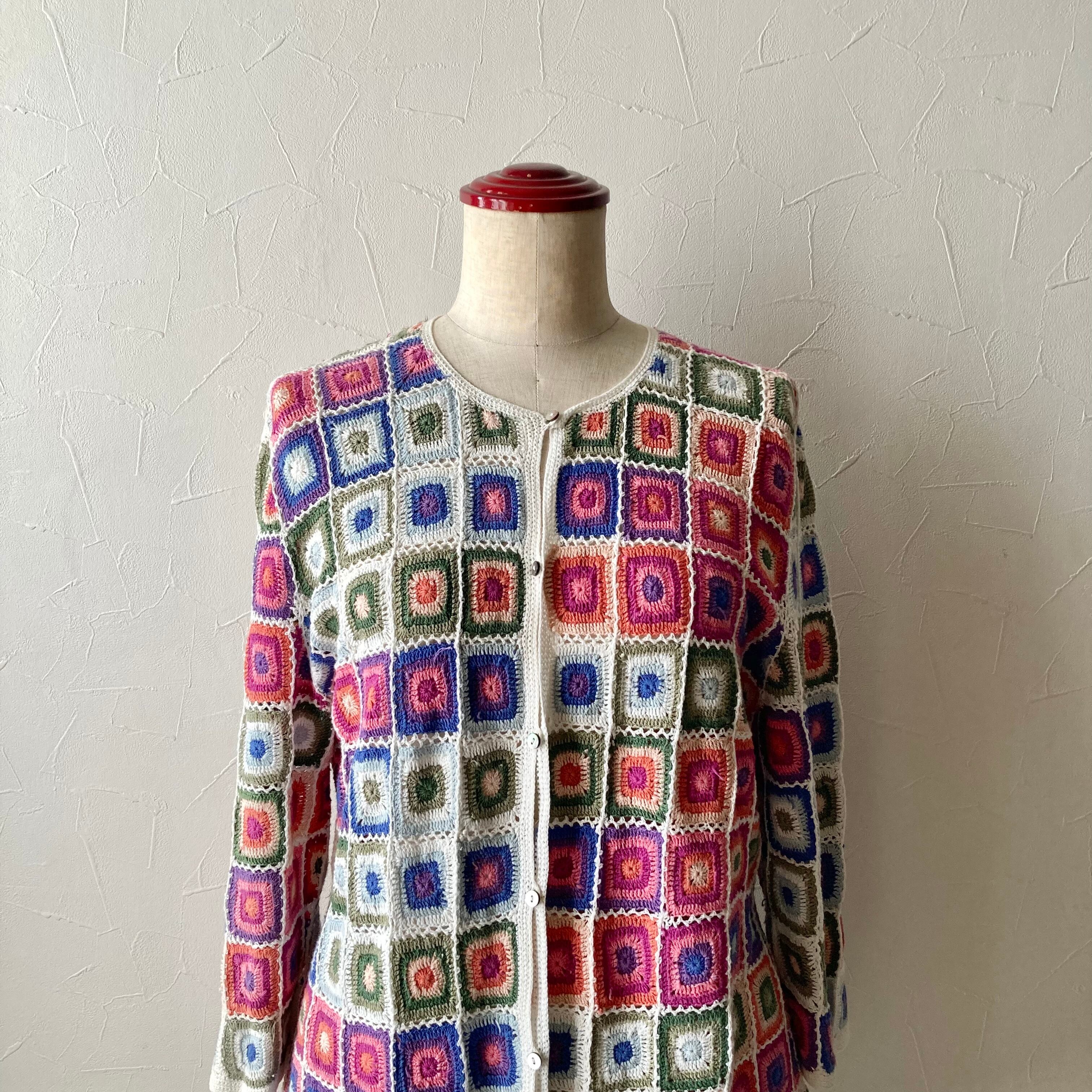 小さめの四角いパターンの七分袖パッチワークニットカーディガン◯ レトロな可愛い色合いです。