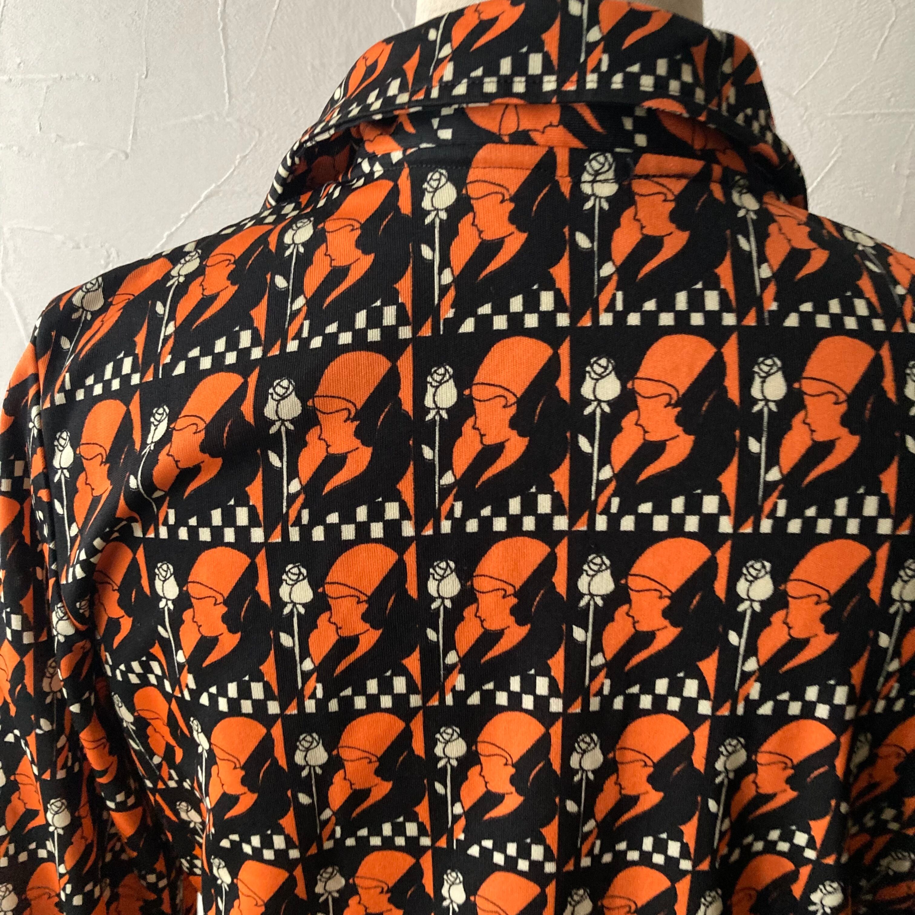 黒地にオレンジの女性と白い薔薇がレトロで可愛いブラウス◯ 70sなオープンカラーのぴったりしたシルエット。ベルボトムと合わせたいコテコテな一枚です♡