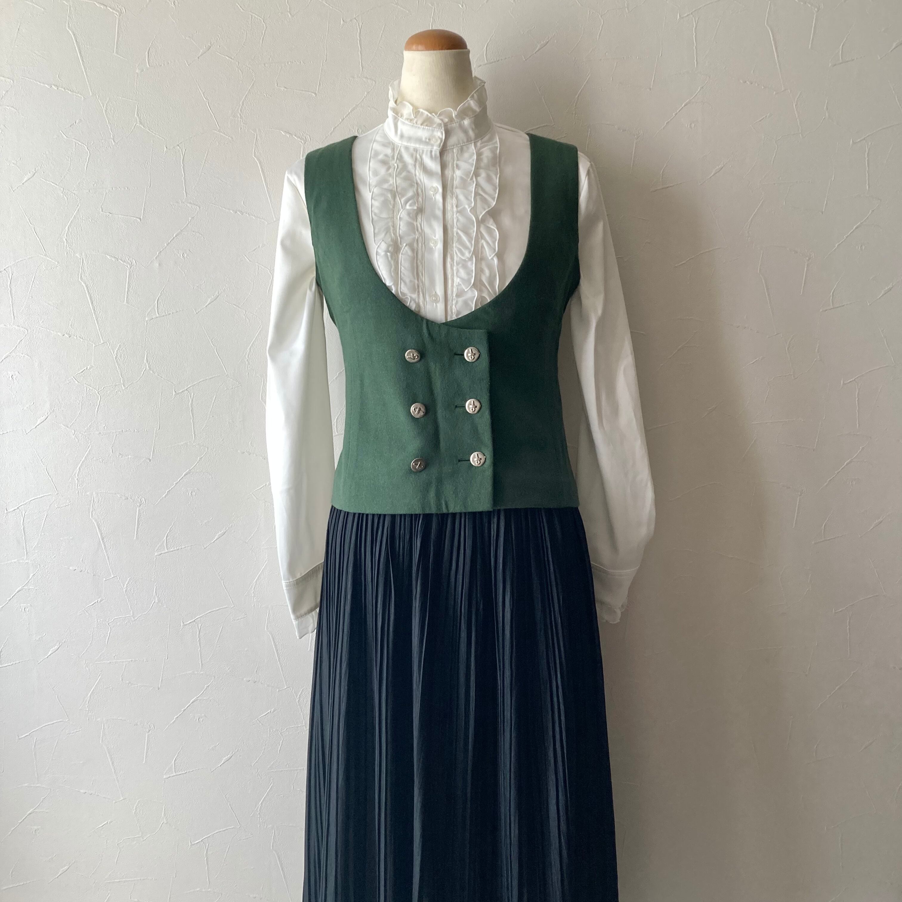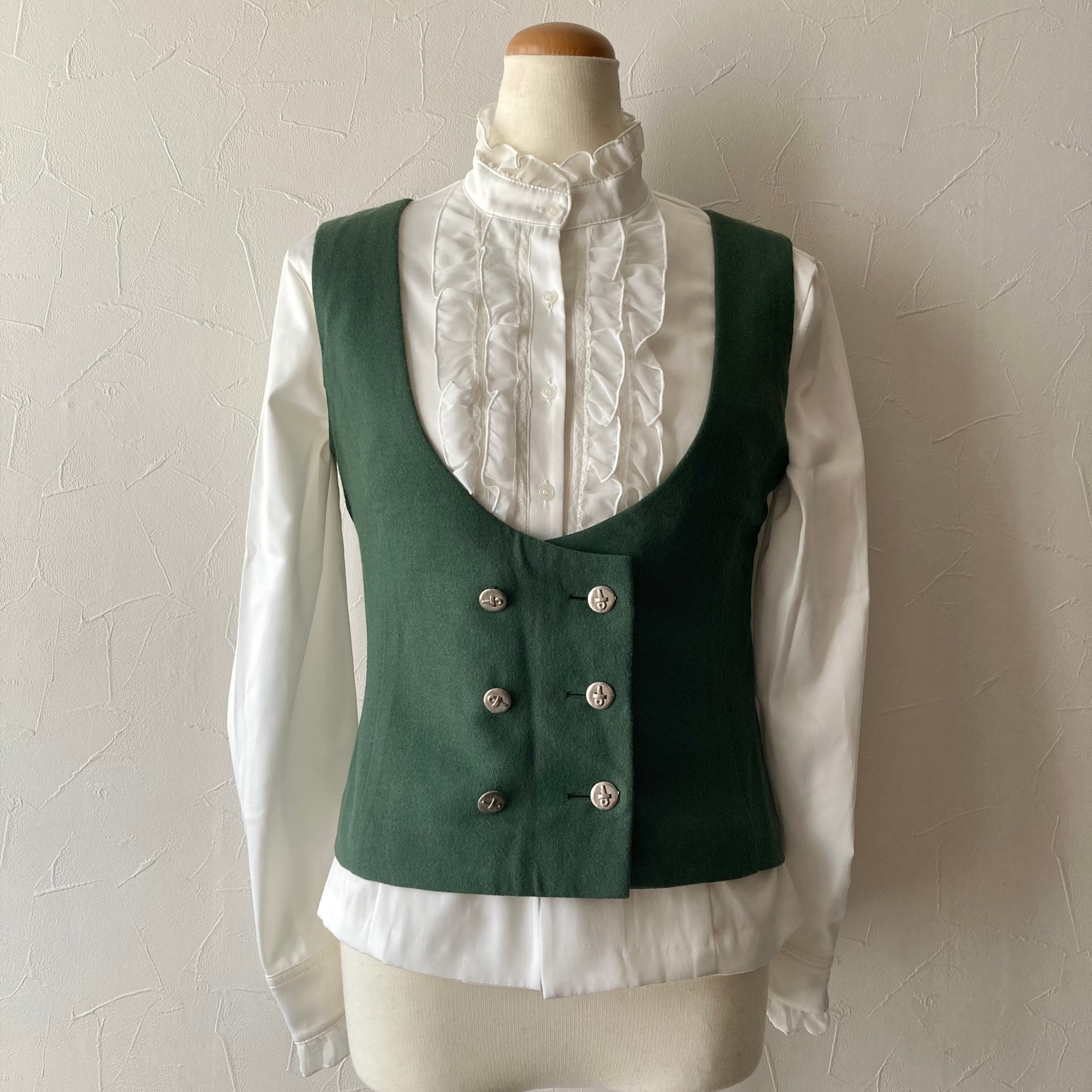 胸のUラインが素敵な緑色のダブルボタンのベスト◯ ウエストもキュッと絞られたデザインでシルエットが綺麗です。ブラウスとの相性がバッチリでエレガントなレトロコーデが楽しめそうです。