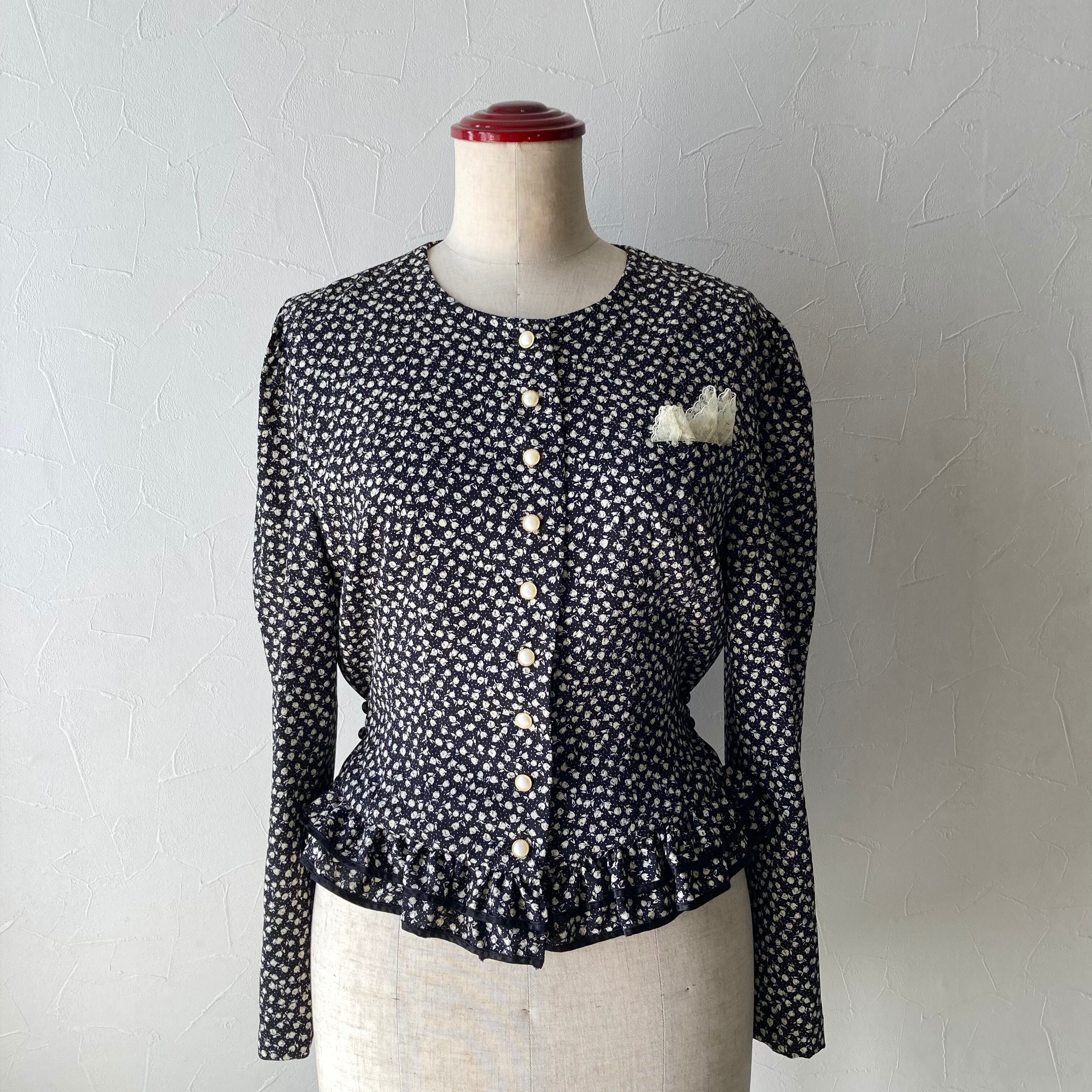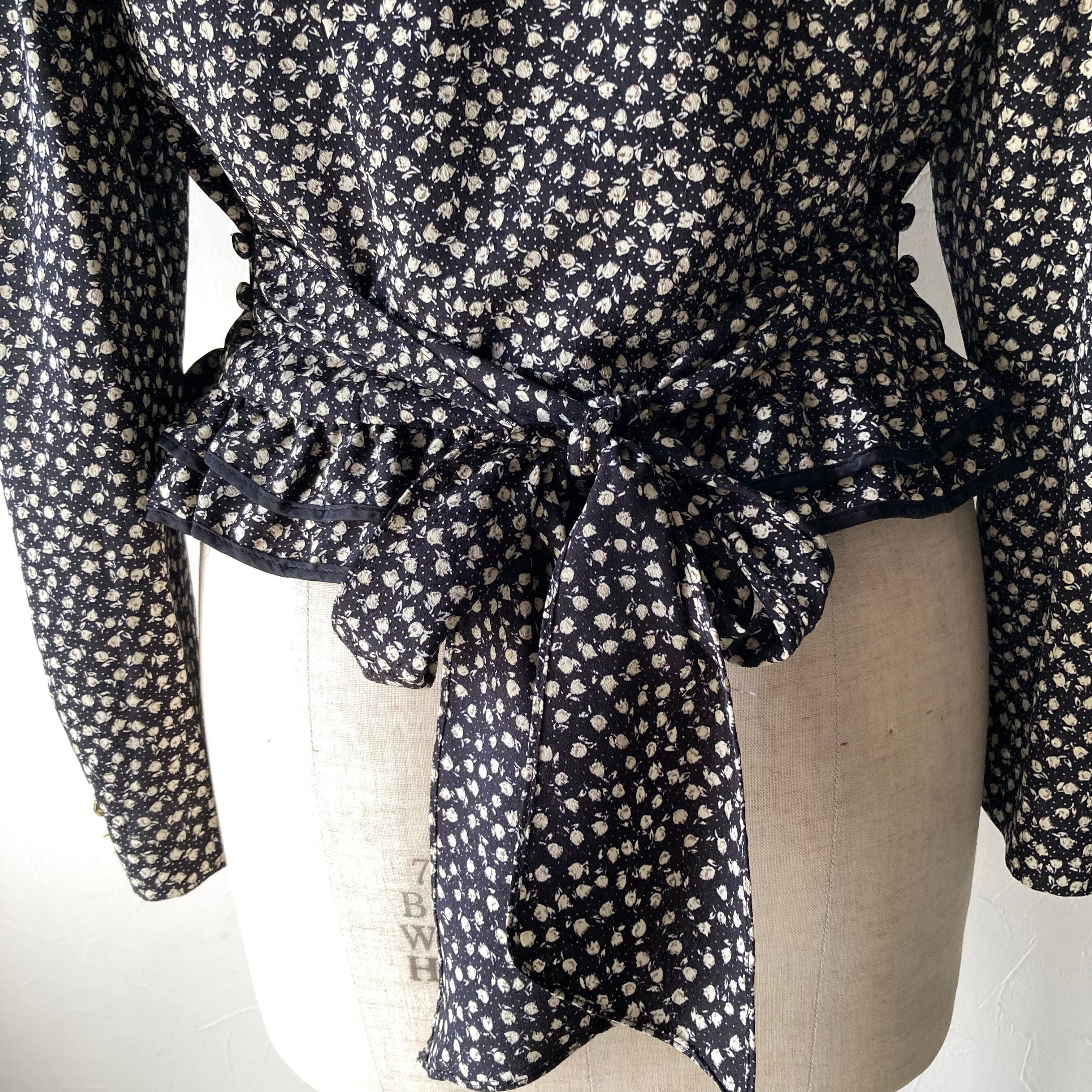 黒地に白い小花柄、パフスリーブにパール風ボタン、ウエストはキュッと絞られて後ろはリボンが付いた上品でクラシカルな可愛らしいブラウスです。裾は二重のフリルになっていて光沢のある黒のパイピングがおしゃれです。