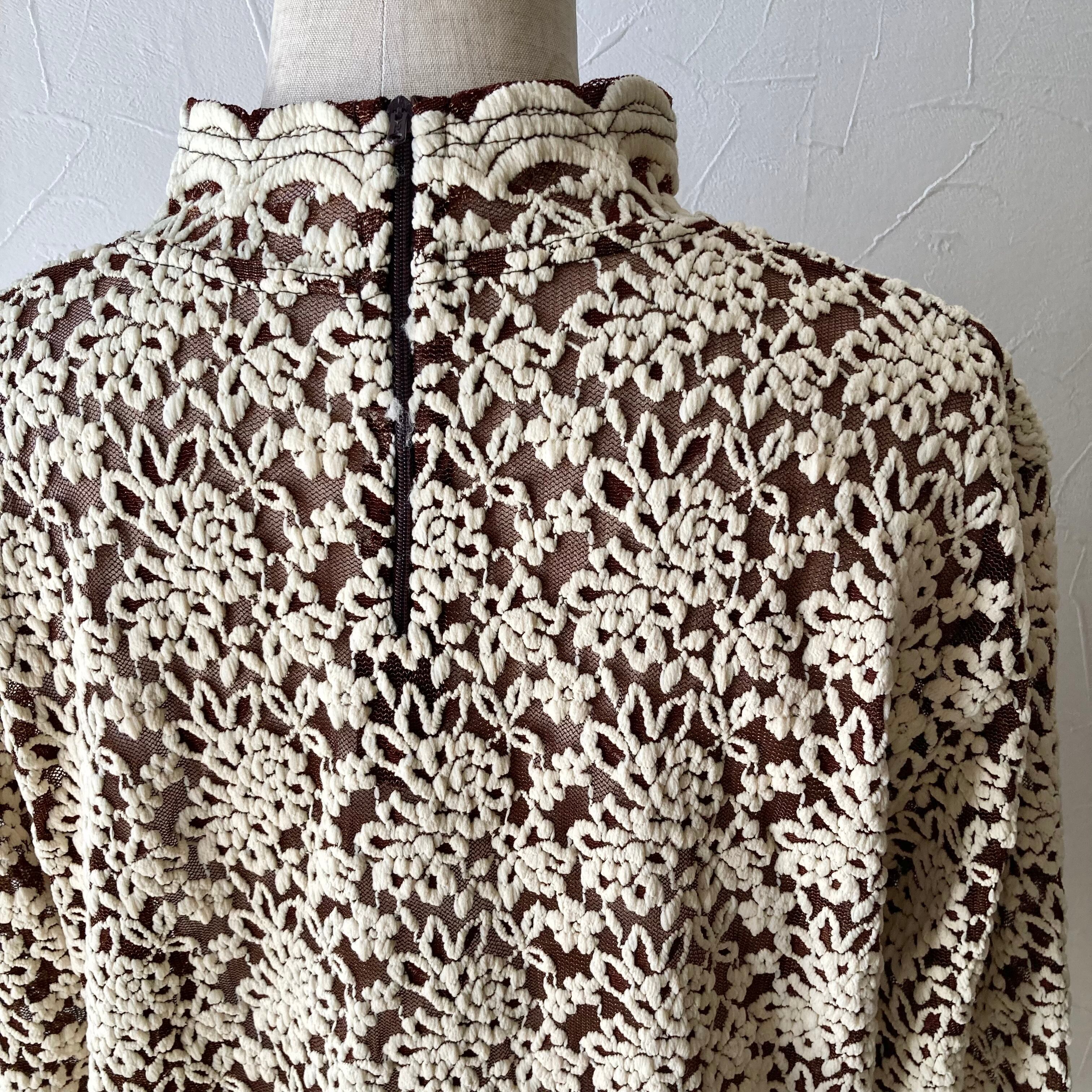 ブラウン×クリームレース刺繍トップス 古着 used vintage レトロ