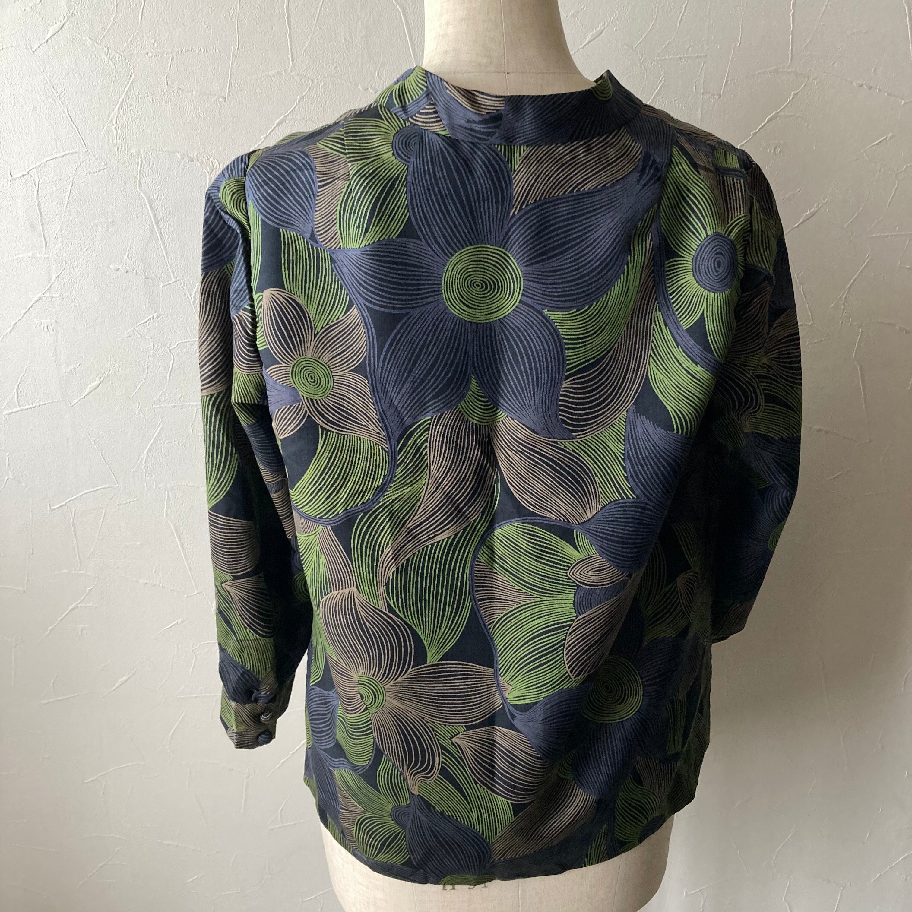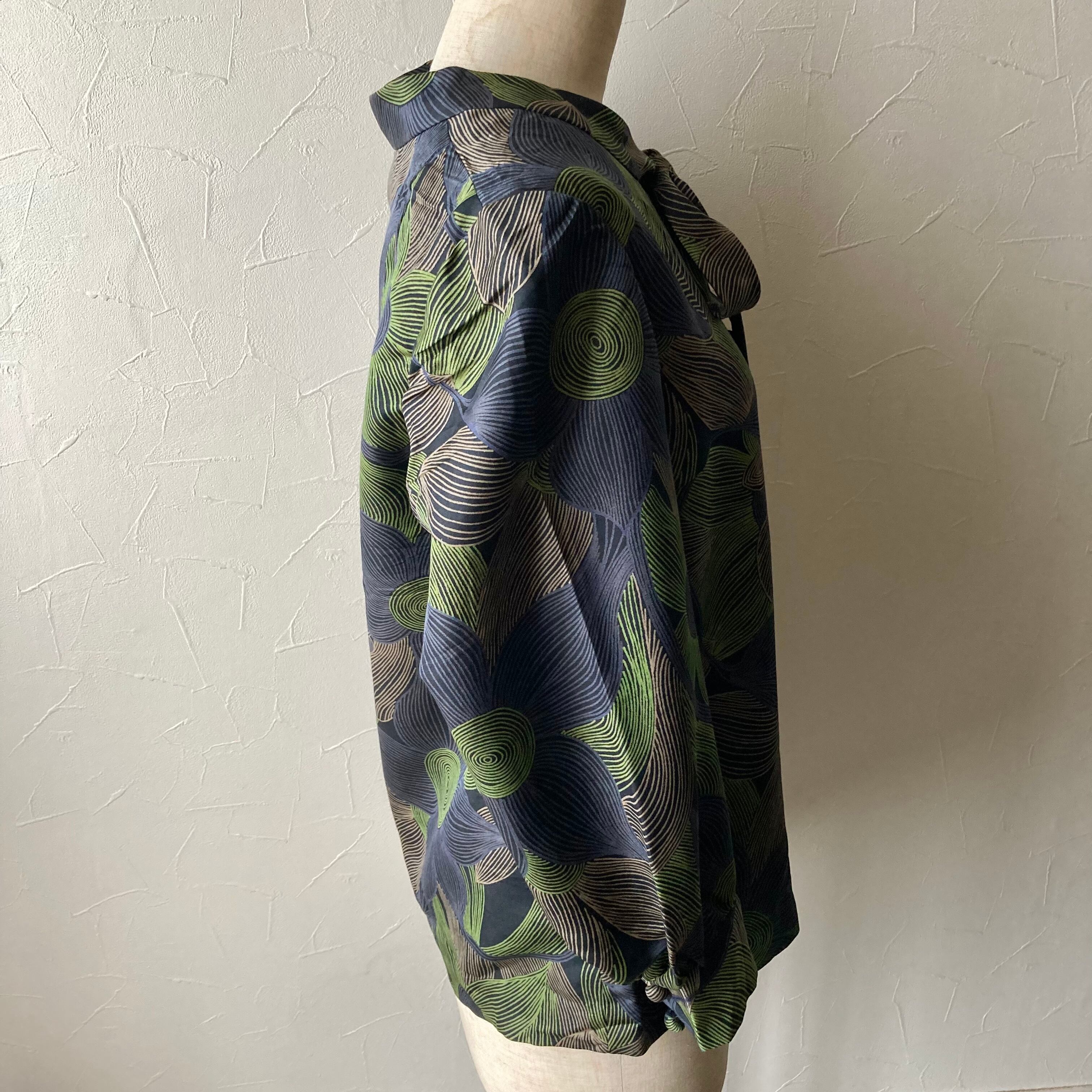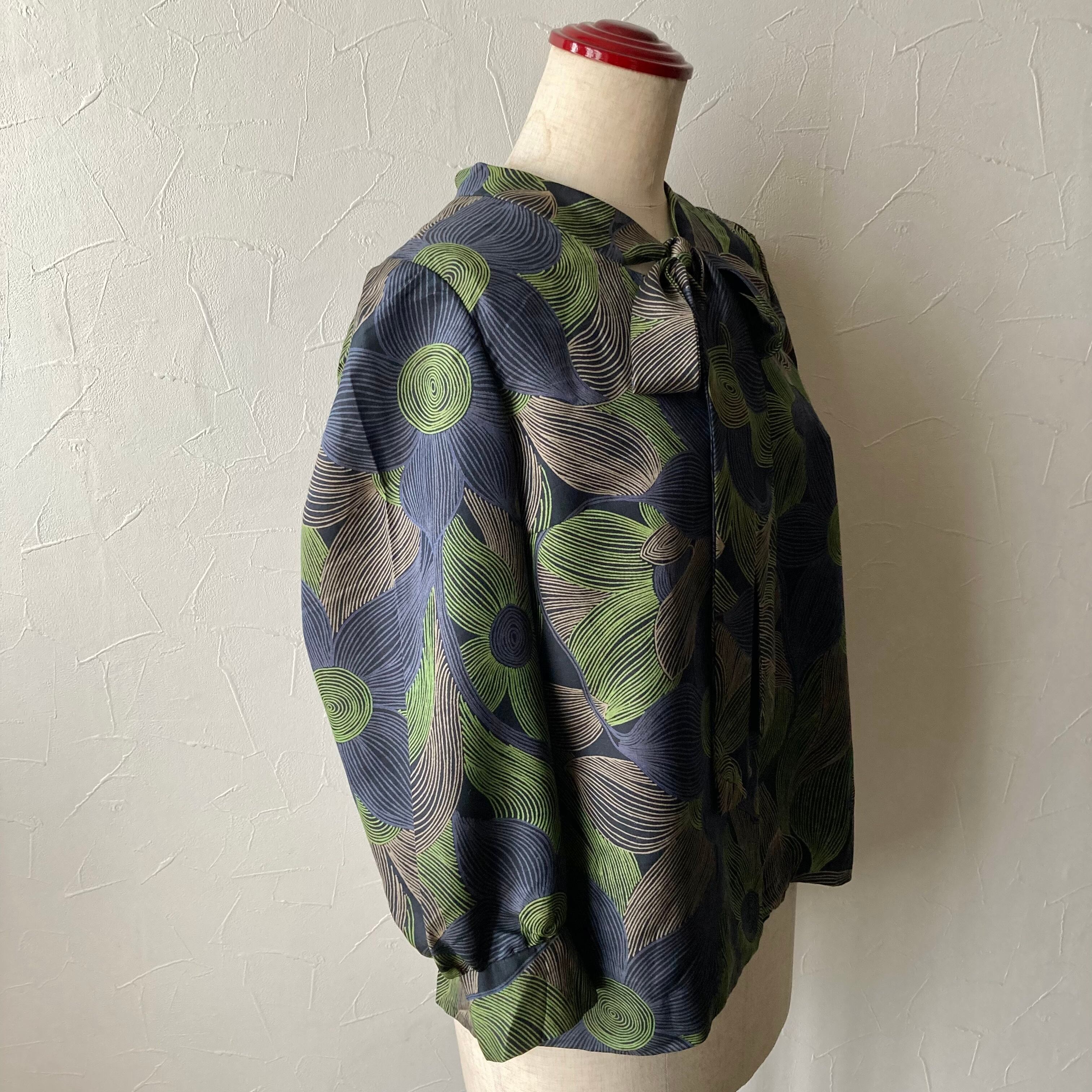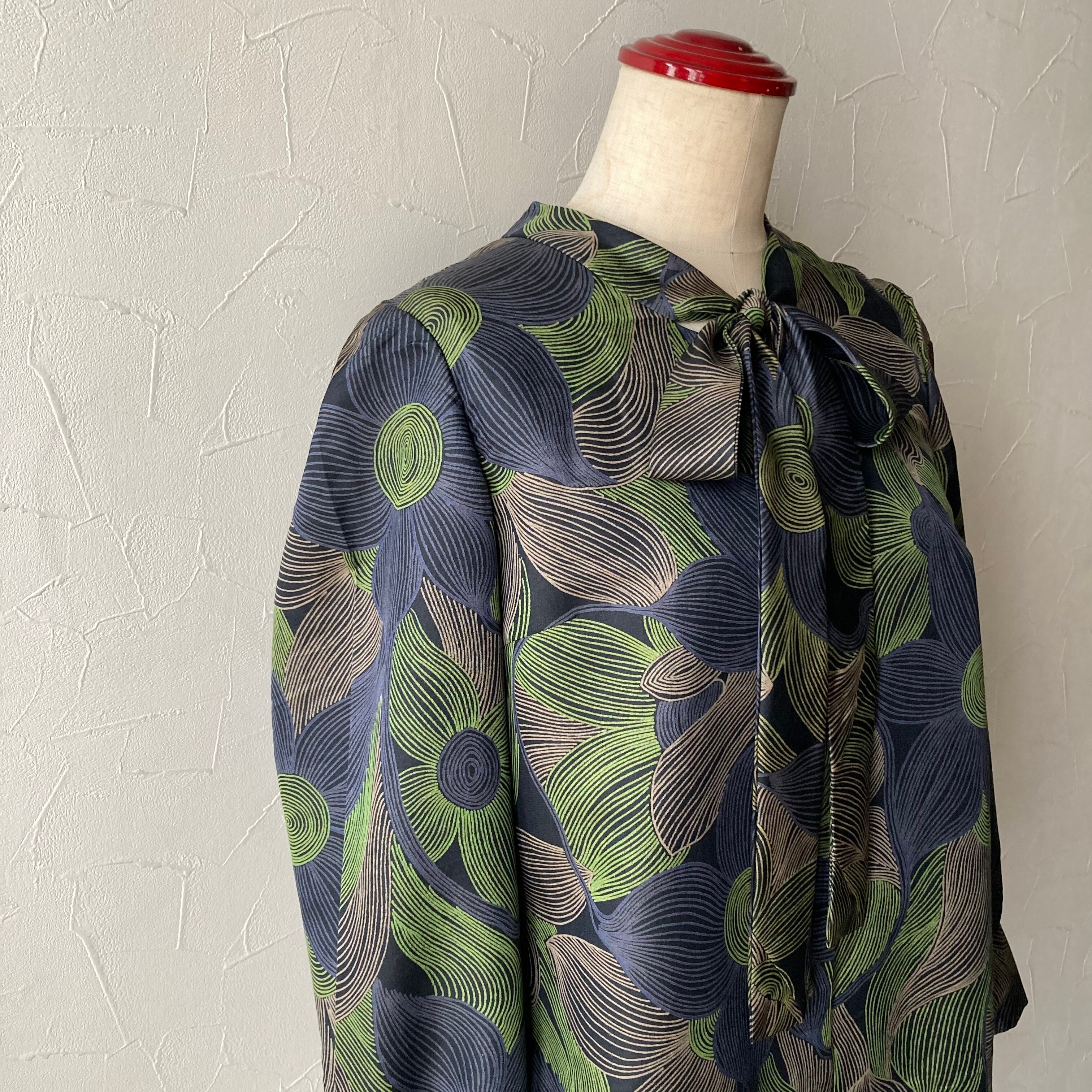 くすんだ3色の線で描かれた花柄がステキなリボンブラウス◯ なめらかな線が美しいです。丸いくるみボタンもレトロで可愛いです。