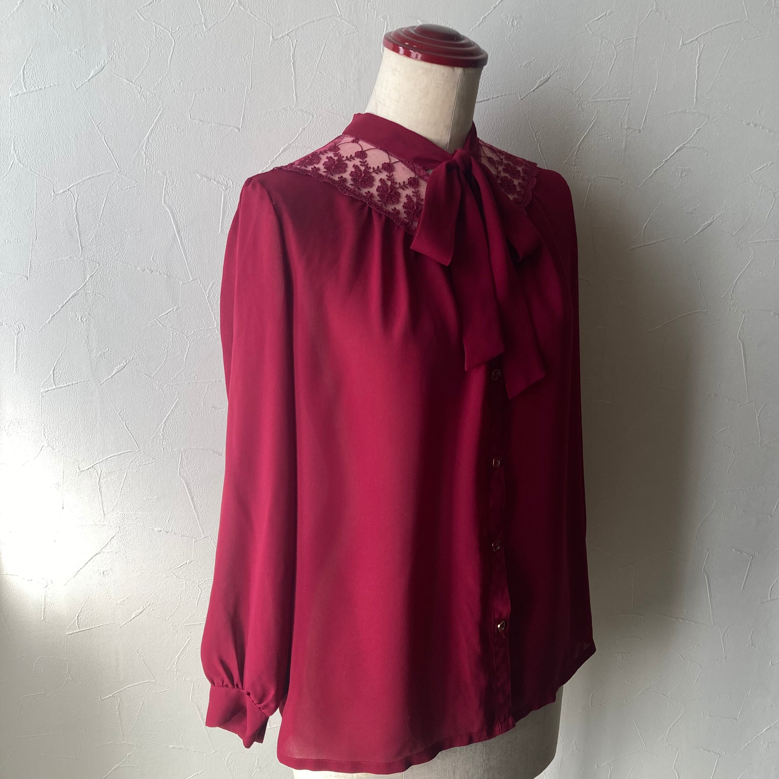 落ち着いた赤色のリボンブラウス◯ 透け感のあるレトロなレース刺繍が可愛らしいです。