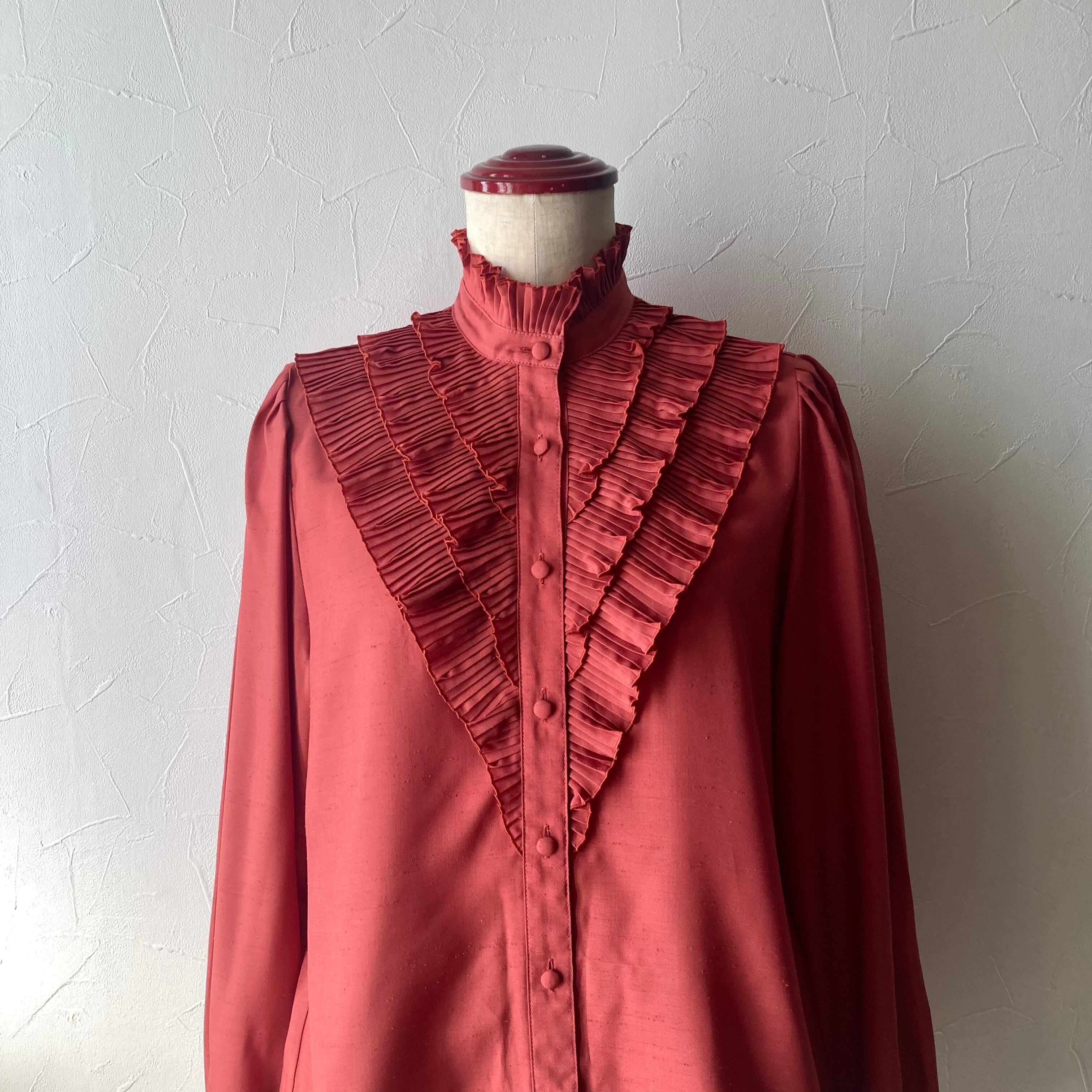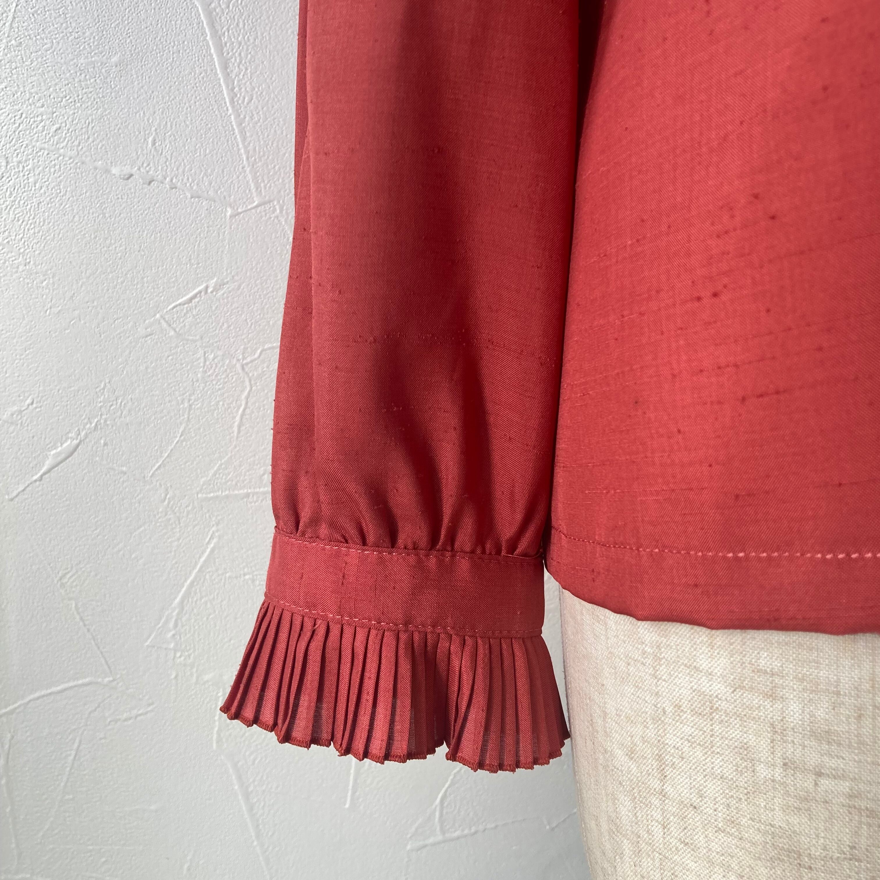 テラコッタカラーのレトロな色味のプリーツフリルブラウス◯ 首回りと胸と袖に細かいプリーツのフリルが施され細部までこだわりのある存在感があるステキな一枚です。
