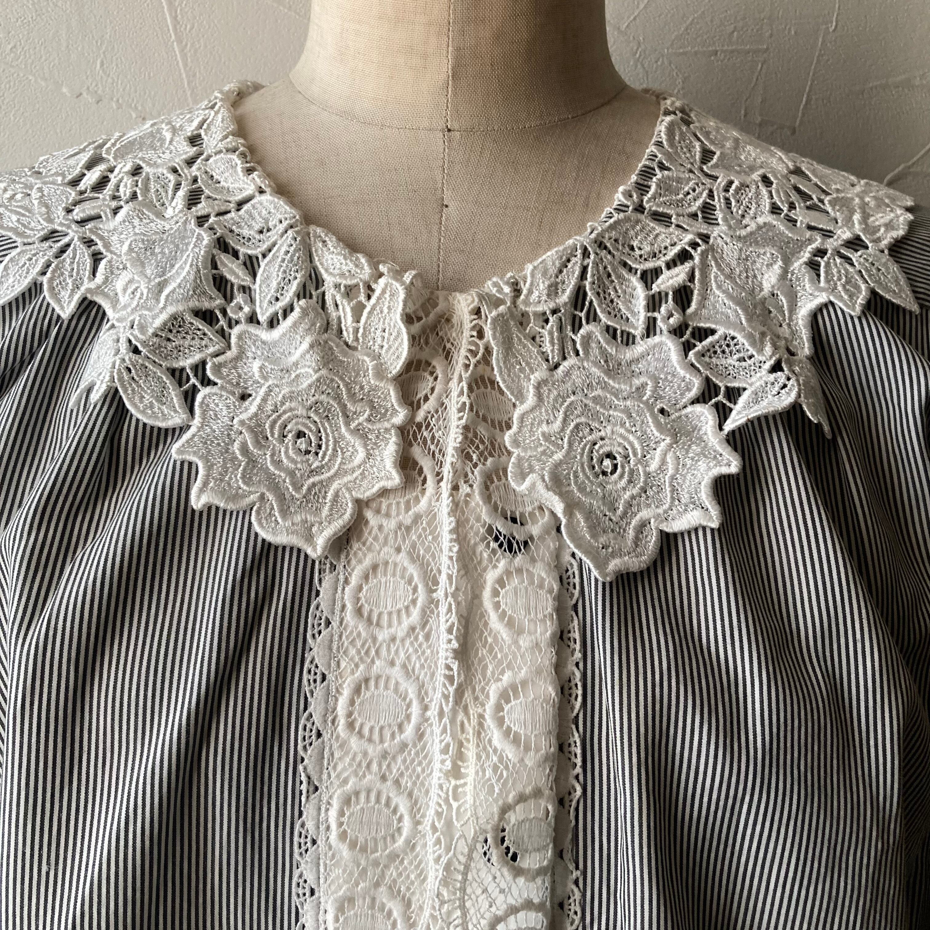 レース装飾ストライプコットンブラウス 古着 used vintage レトロ