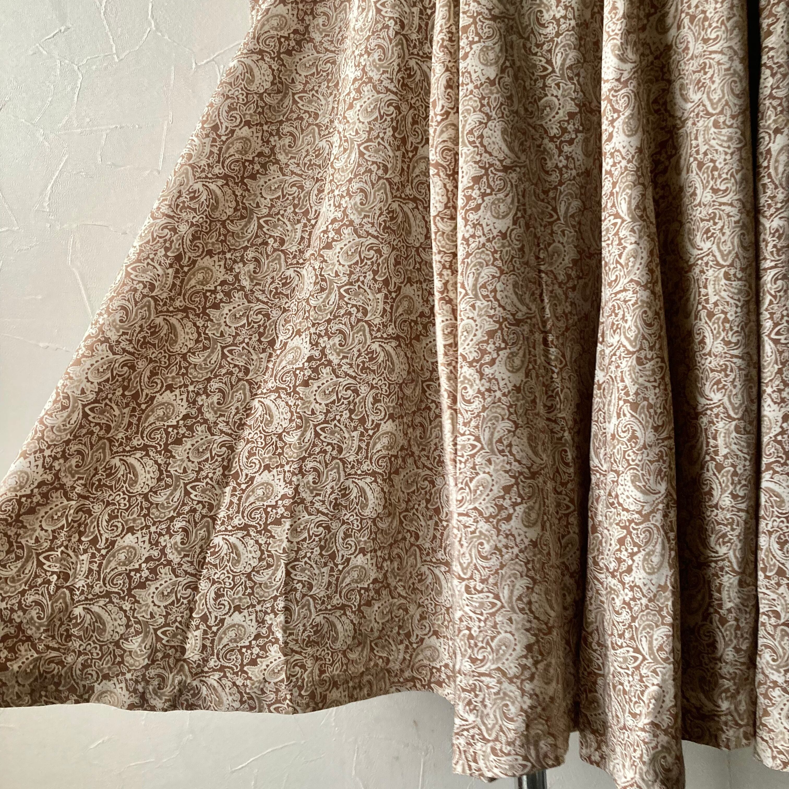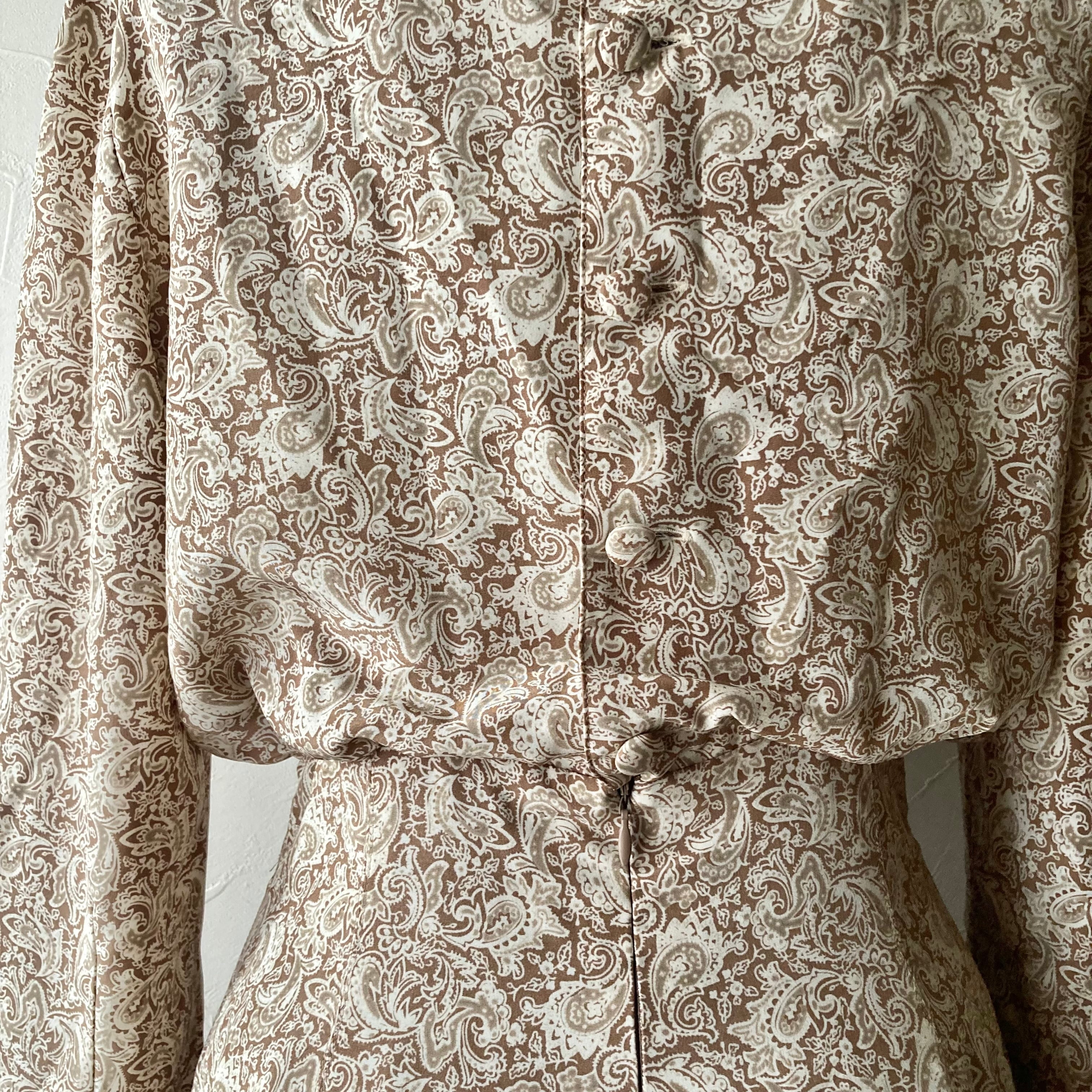 優しい色合いのやわらかなペイズリーやボタニカルな柄のレトロなワンピース◯ ウエストが締まったデザインとフレアスカートがひらひらと美しいシルエットです。後ろのくるみボタンもおしゃれな印象。落ち着いた大人上品なワンピースです。