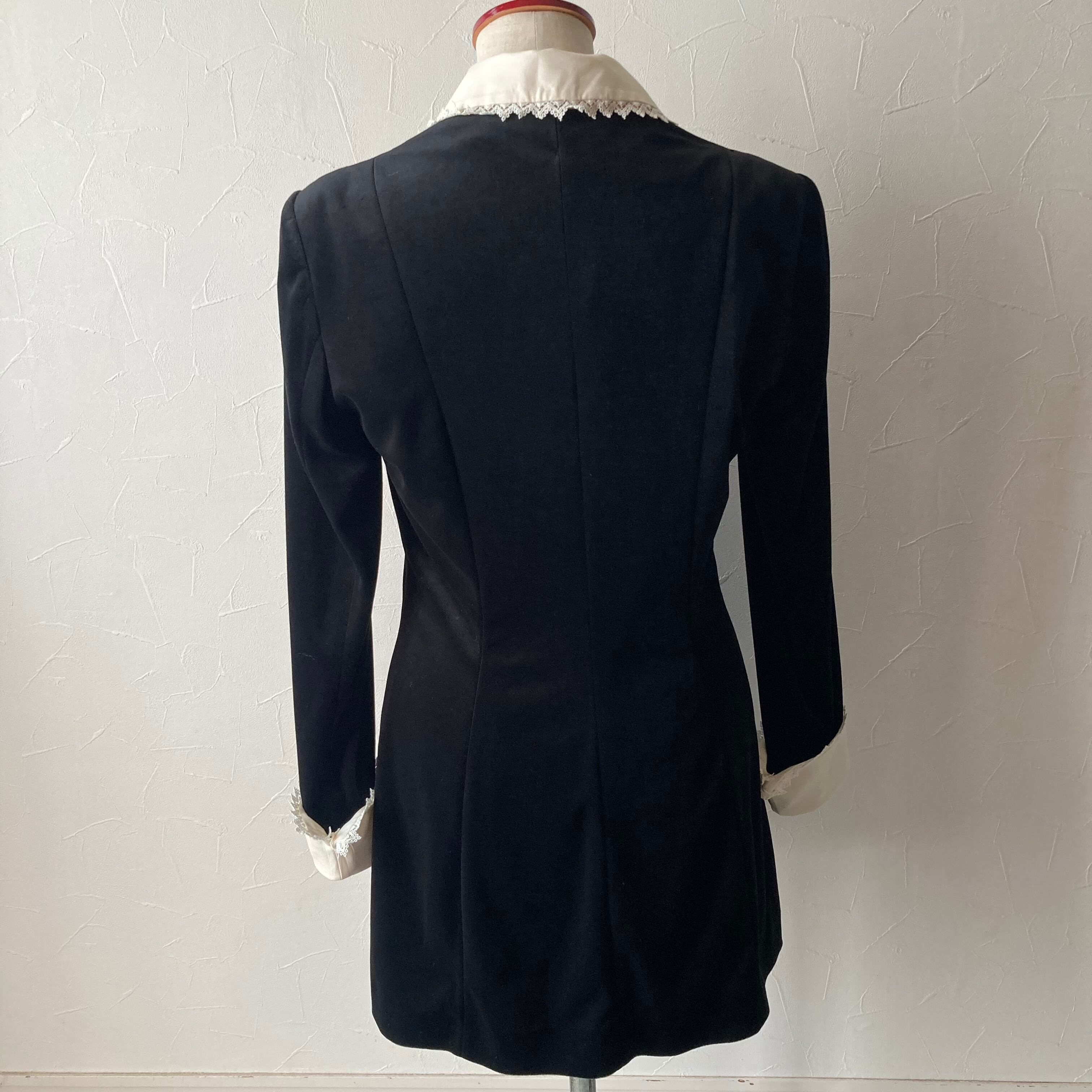上品な黒のベロア素材のジャケット◯ ホワイトの襟と袖口、襟と胸の間に少し肌が見えるデザインがとってもお洒落です。くるみボタンも可愛いポイント。襟と袖口は取り外し可能なのでコーデによって楽しめる1着です。
