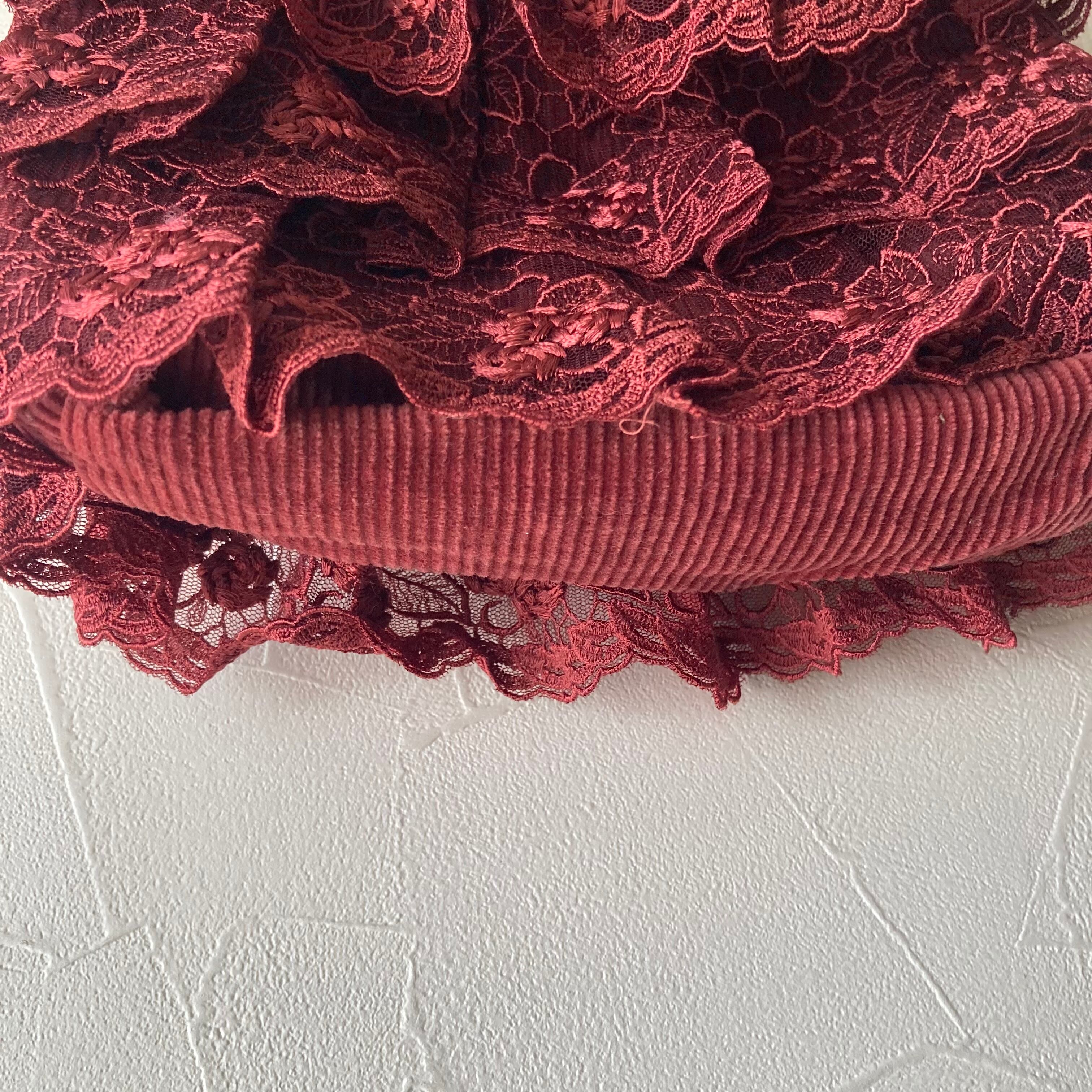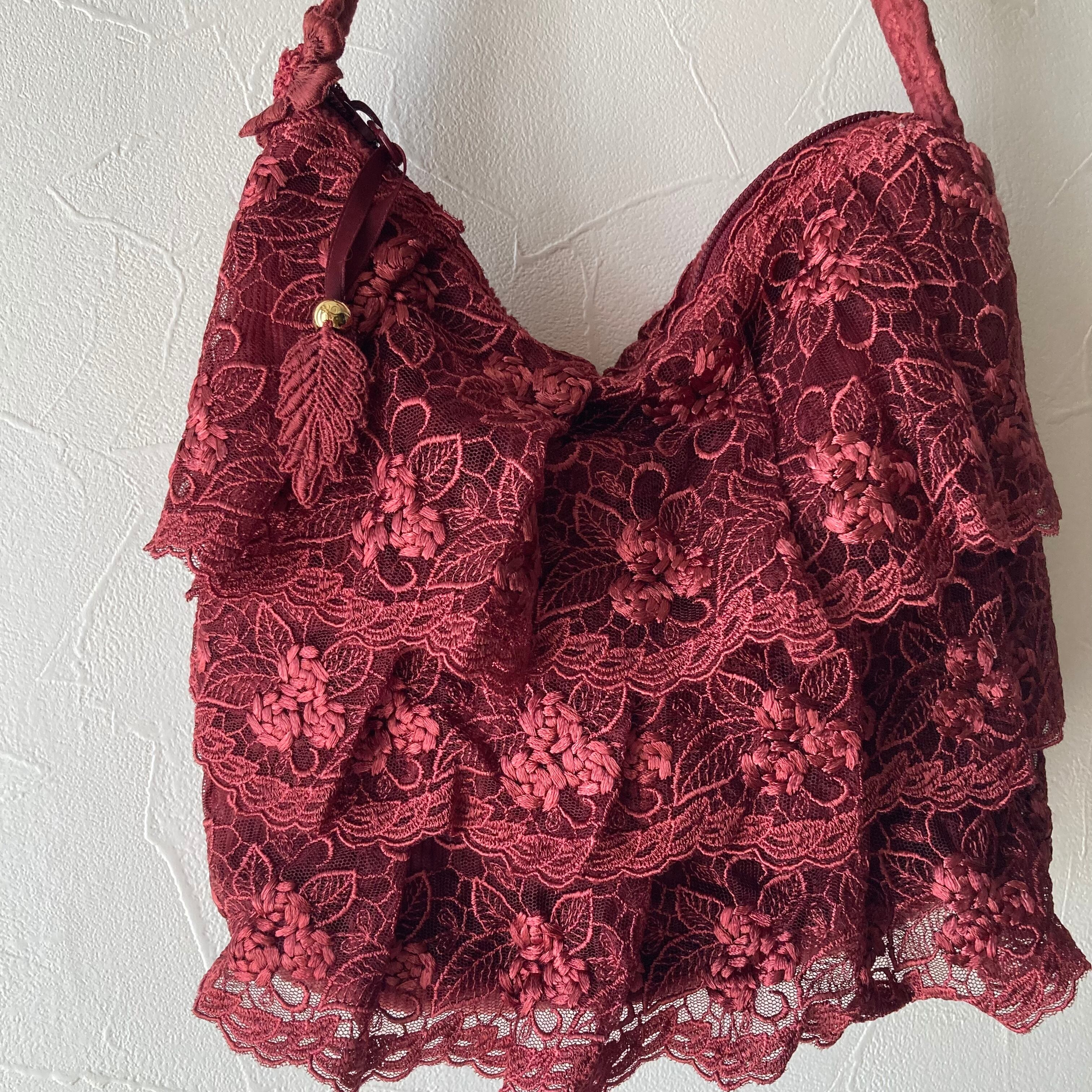 コーデュロイにレトロなレースがひらひらと装飾された可愛らしい肩掛けバッグ◯