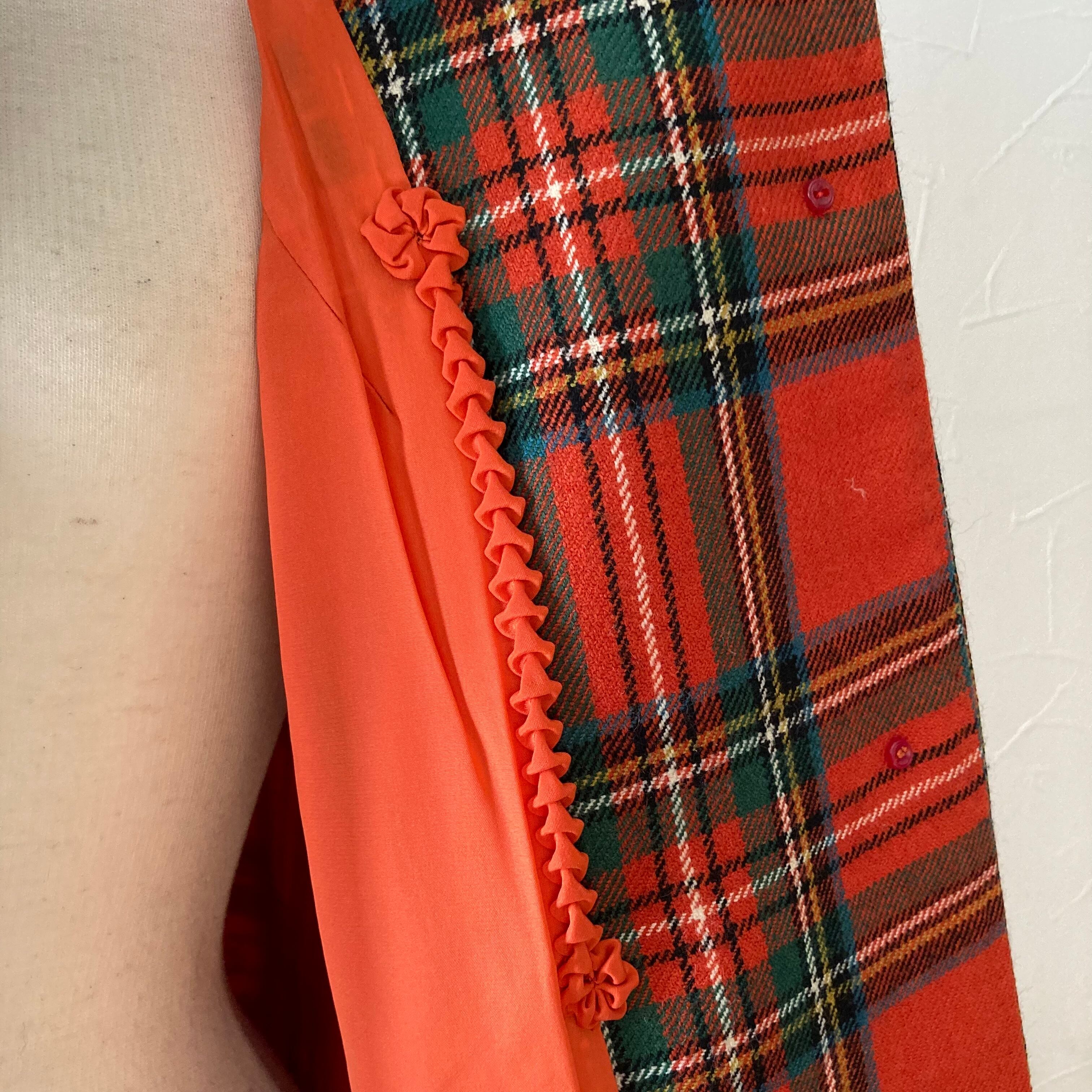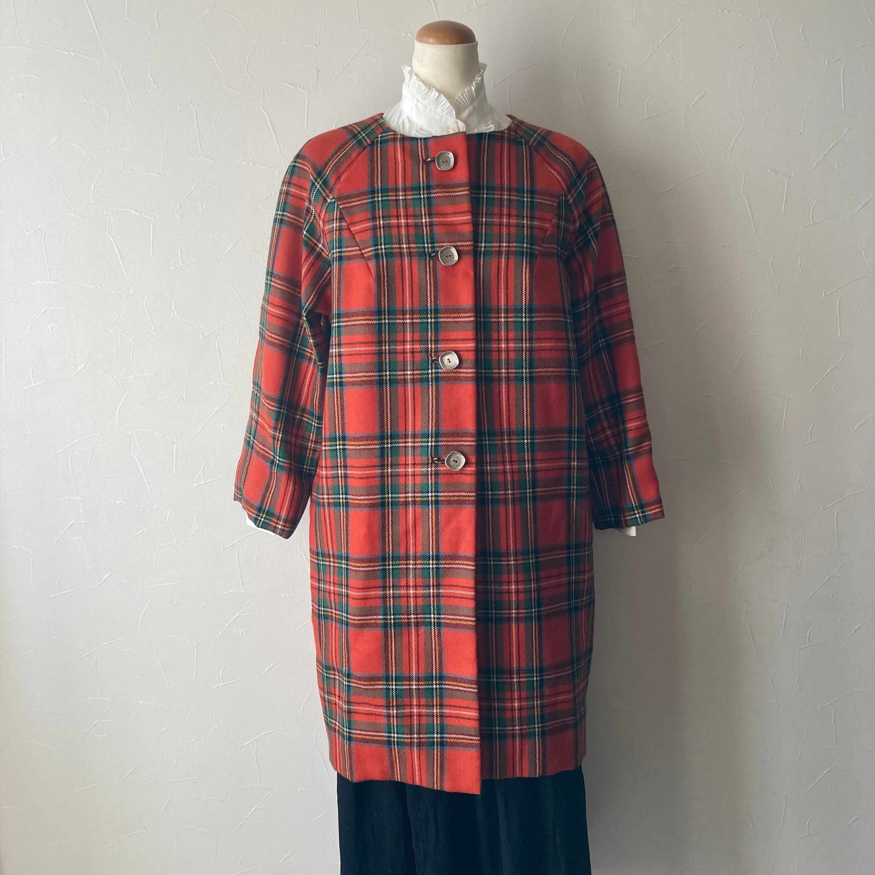 レトロで可愛い配色のタータンチェックのノーカラーコート◯ ノーカラーですのでブラウスの襟を出したりタートルネックと合わせたり可愛く変化させることができます。すとんとしたシルエットとレトロなシルバーの四角いボタンも可愛くハンドメイドの温かさも感じます。