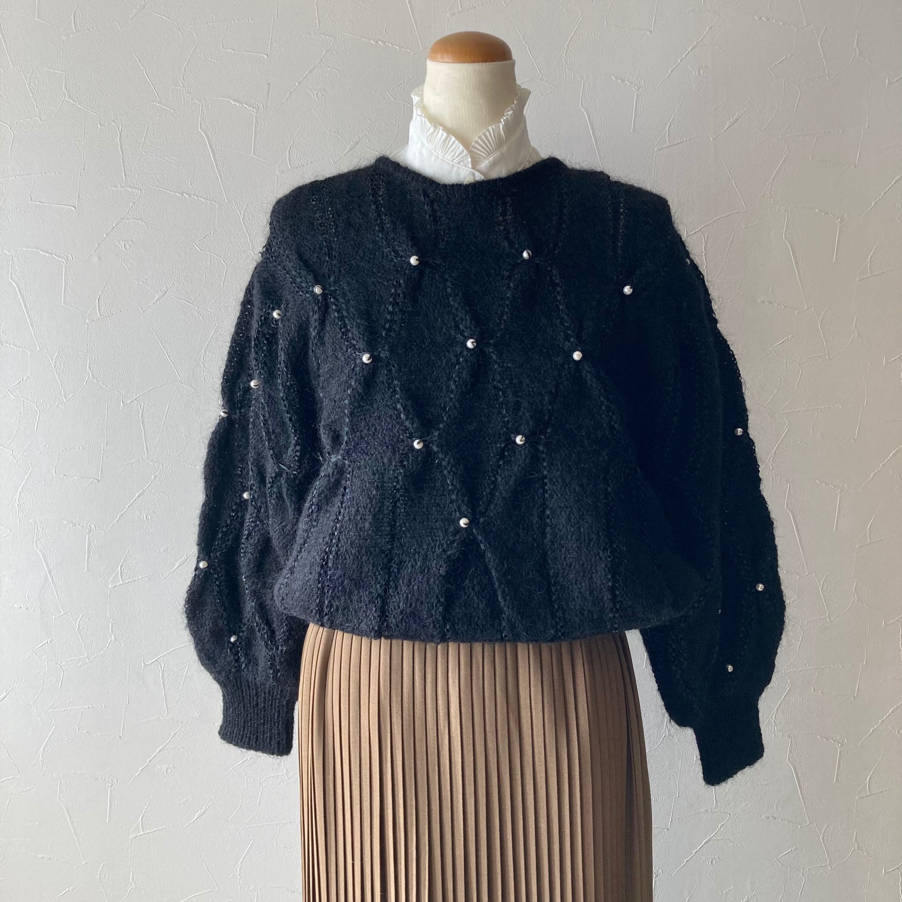 黒のレースとパールビーズの装飾が可愛らしいニット◯たっぷりとした袖のデザインのシルエットも素敵です。