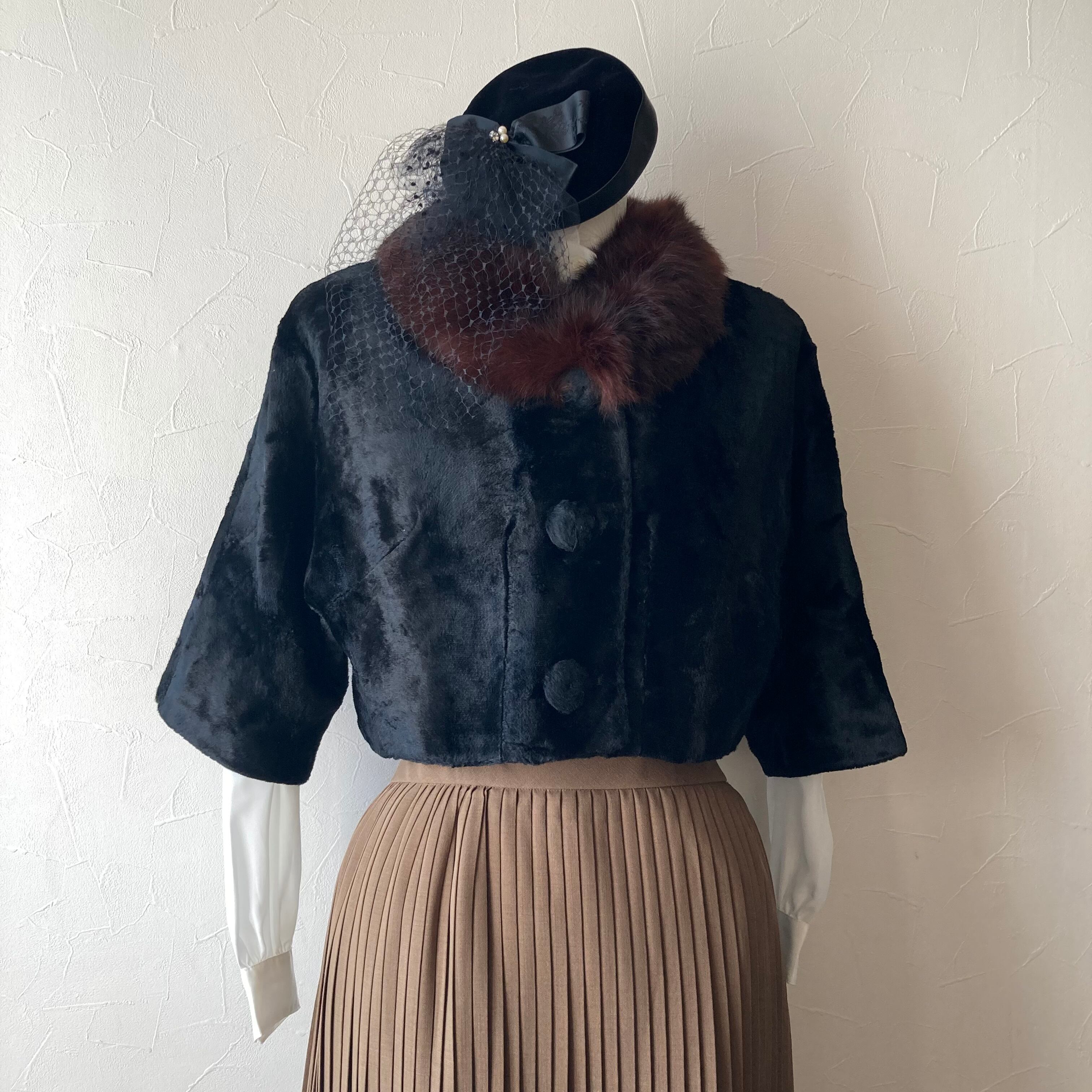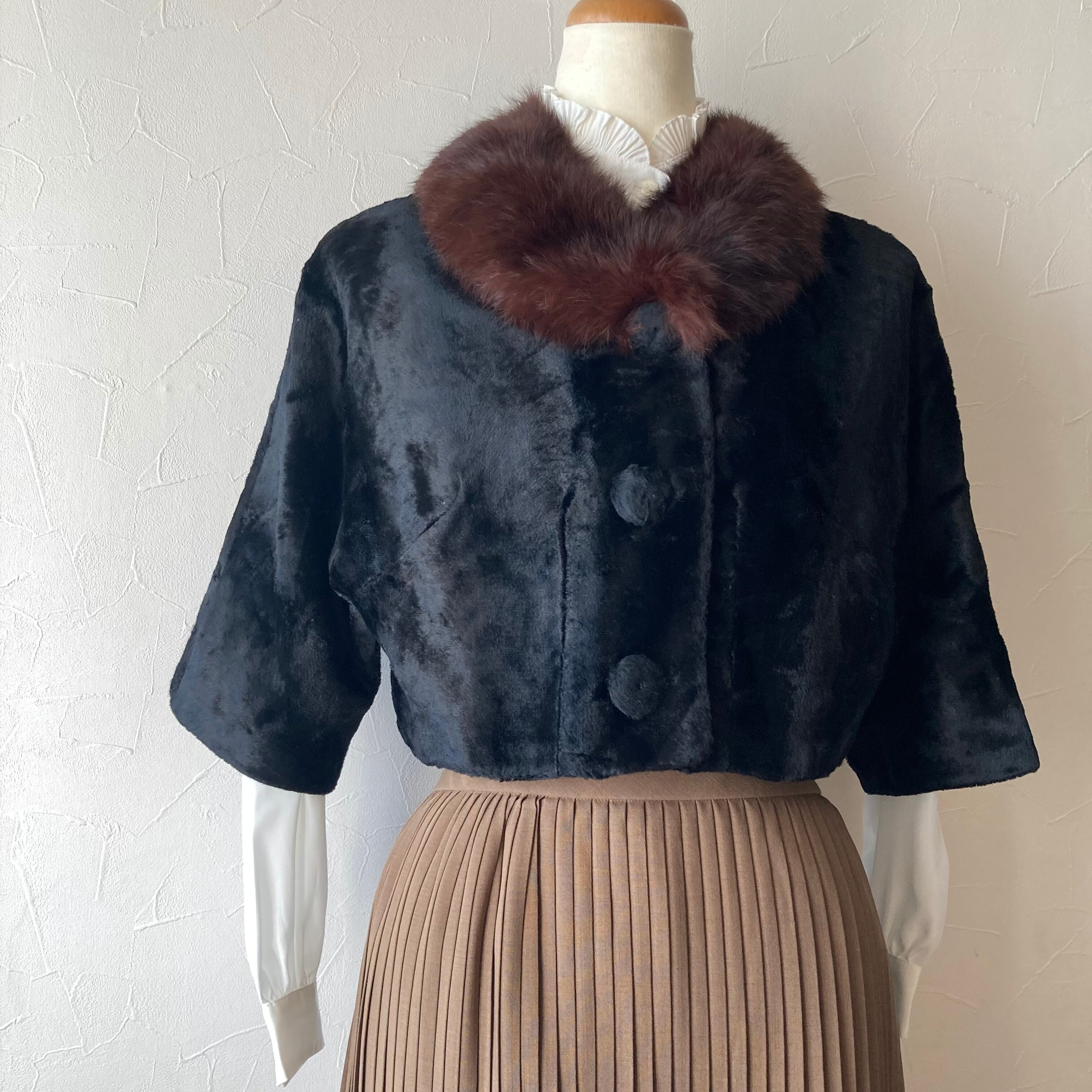 光沢のあるしなやかな黒色のファー付きジャケット◯ 上質なファーが特別なお出かけにぴったりです。ショート丈でスタイルも良く見え、肘が隠れるくらいの袖丈も下に合わせるもので一味違ったレトロコーデが楽しめます。