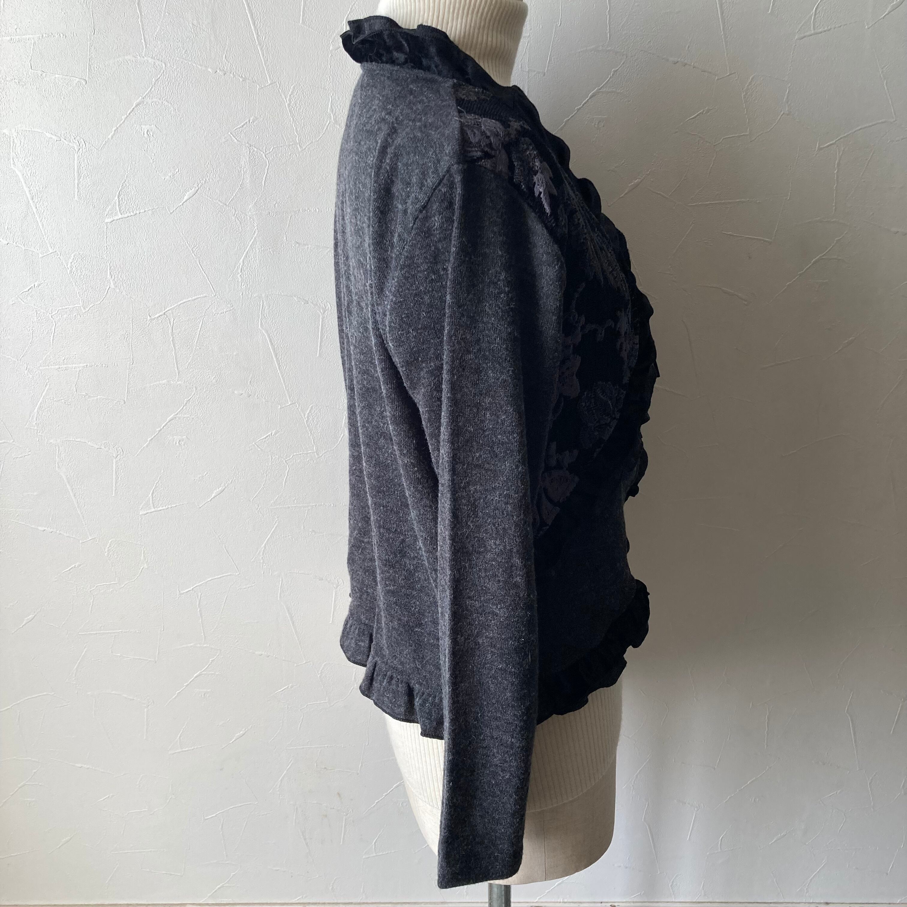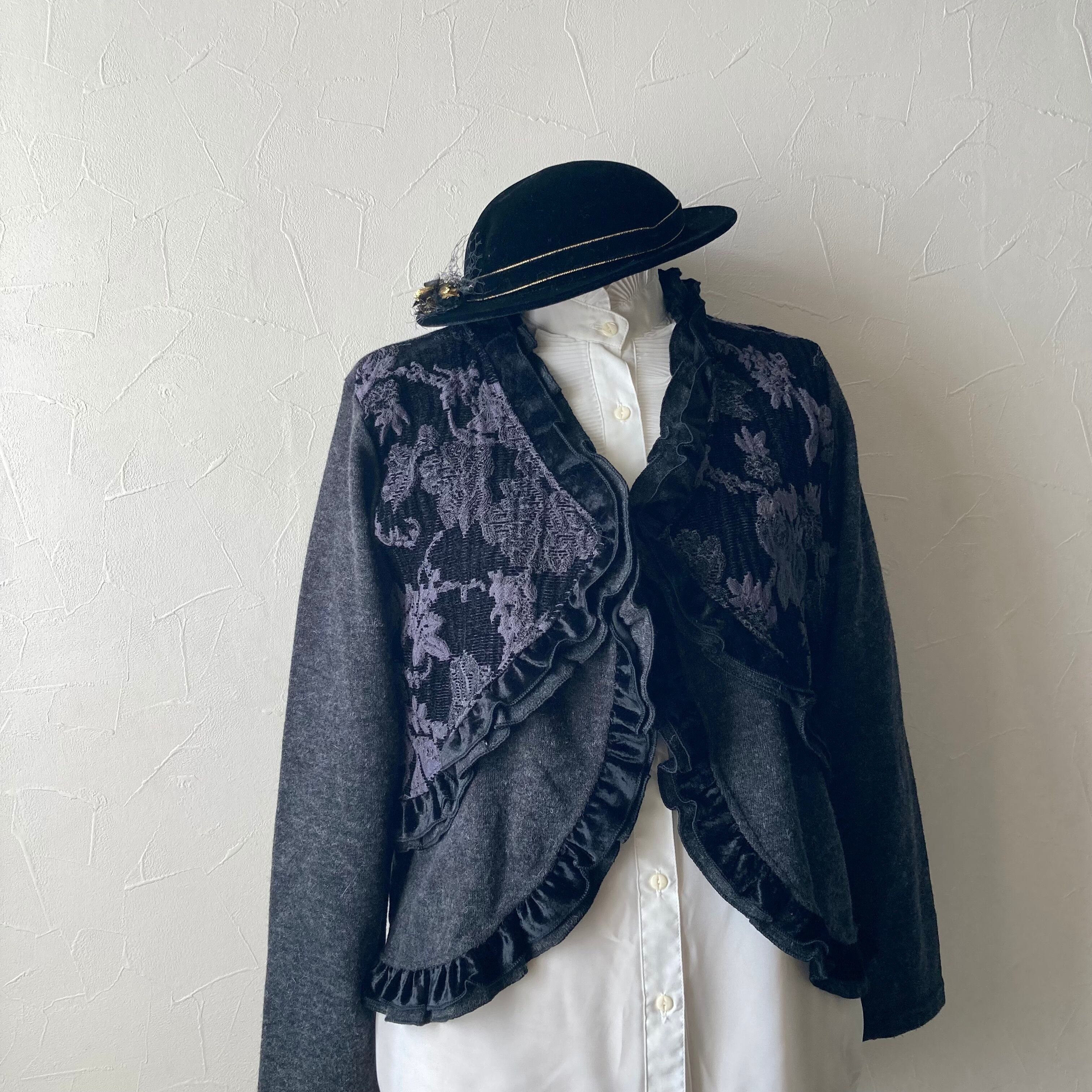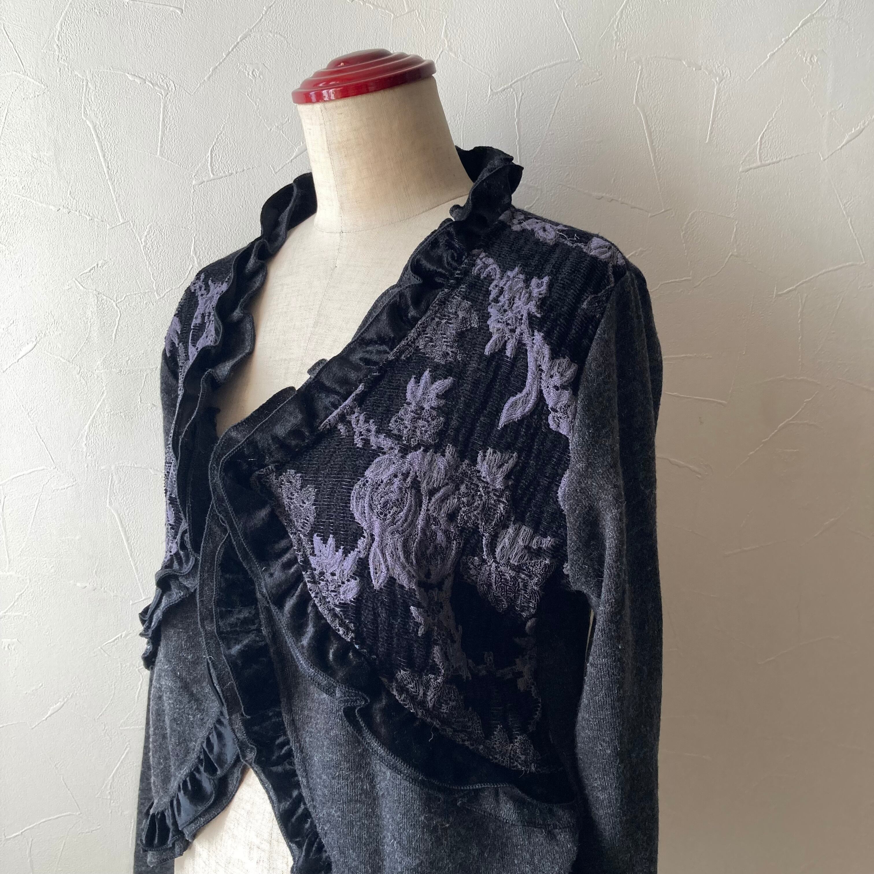 レース風なボタニカル刺繍とフリルにはベロア素材、モノトーンカラーの上品な雰囲気のトップスです。カーディガンのような作りで前は紐で結ぶデザインです。柔らかな素材でお洒落ですが着心地もよいおすすめな一枚です。