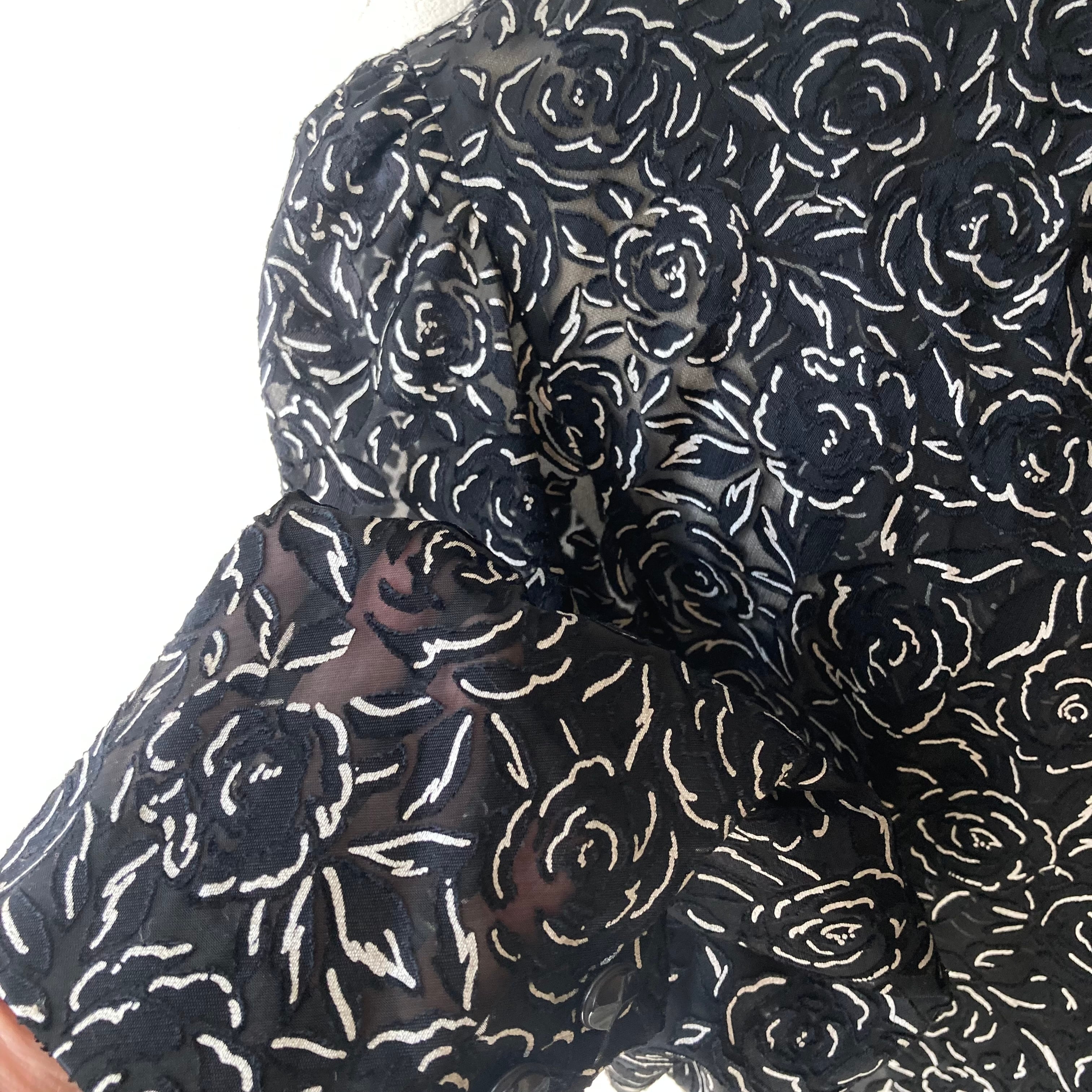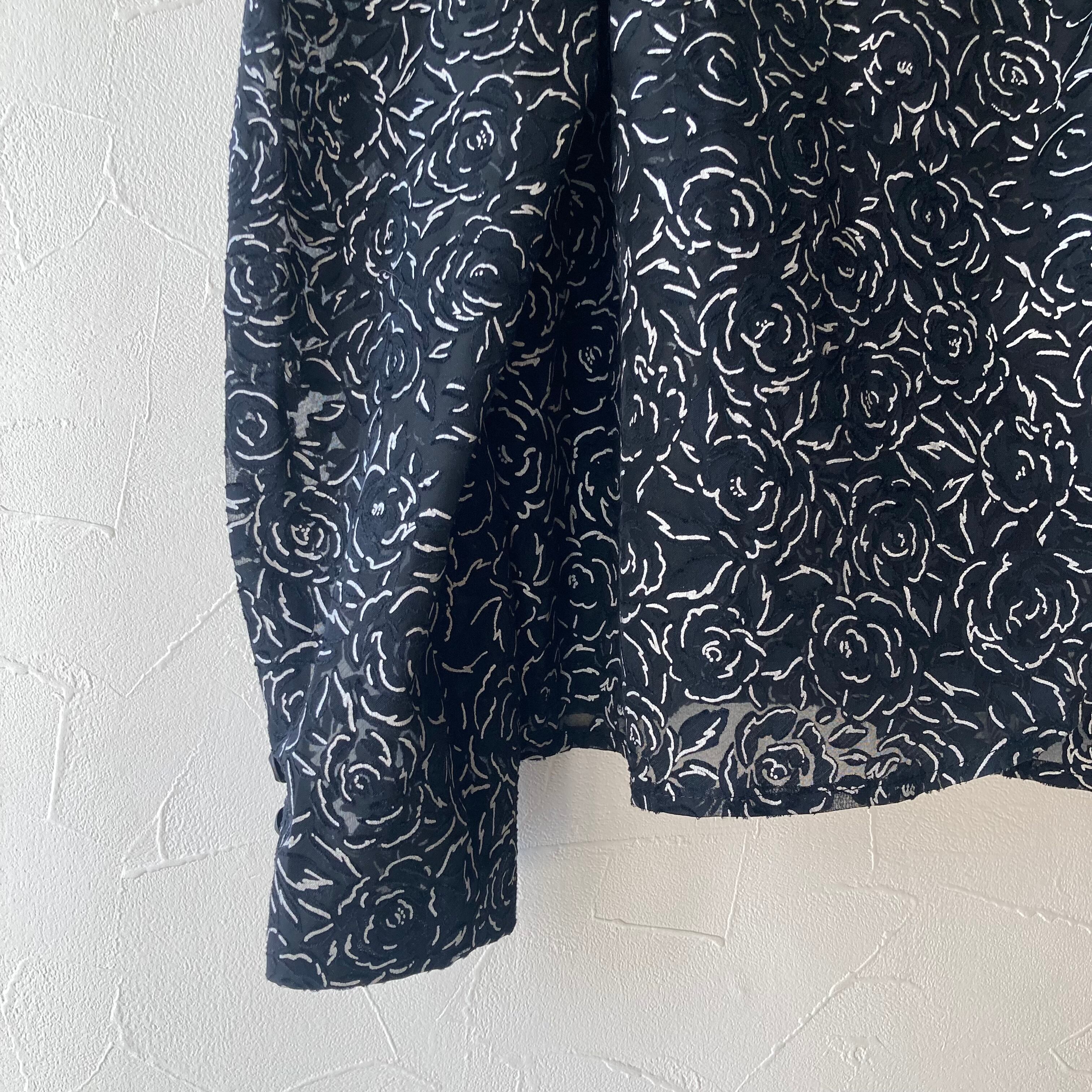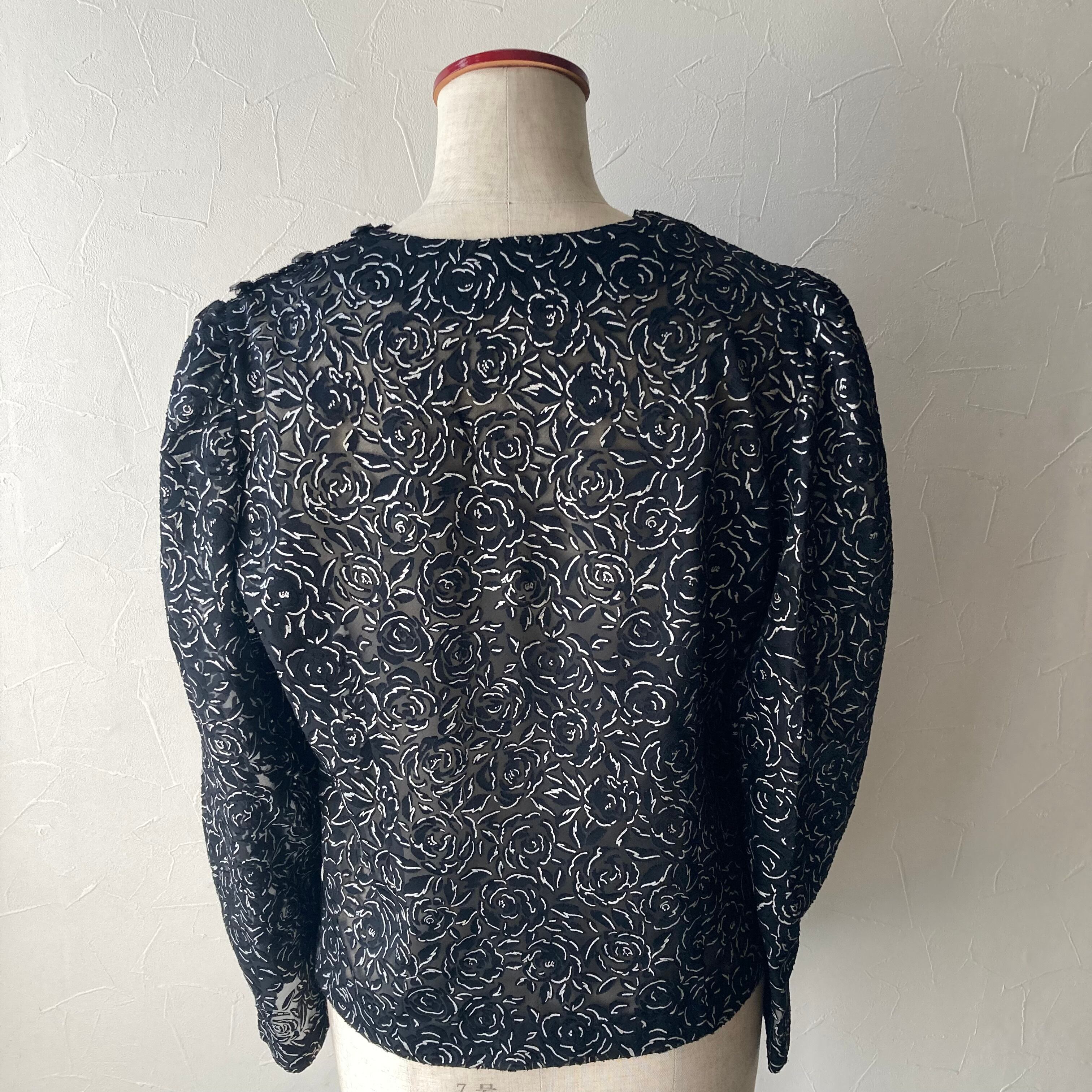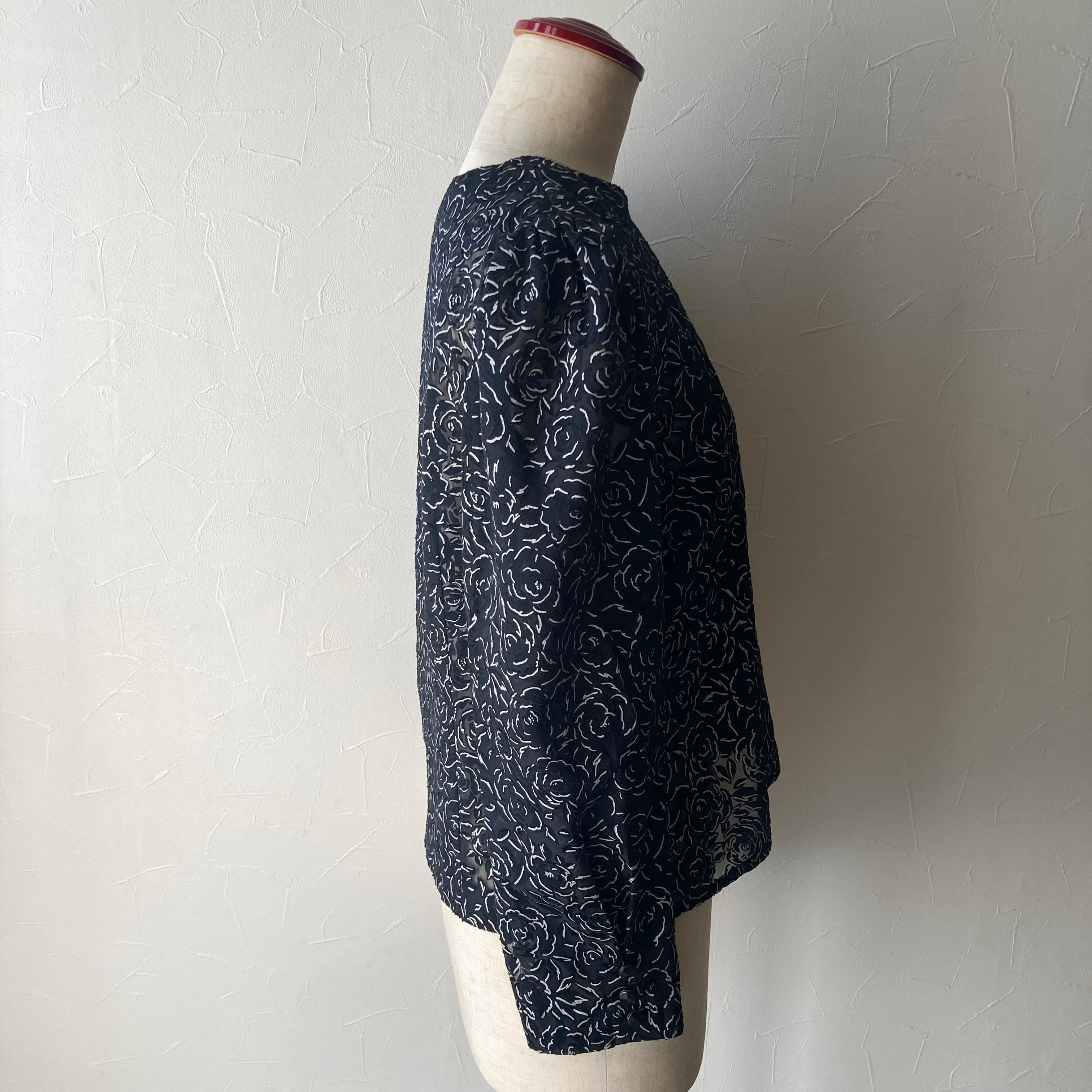 パフスリーブにデザインが豊かなレトロトップス◯ 透け感のある黒に白の花模様が美しいです。