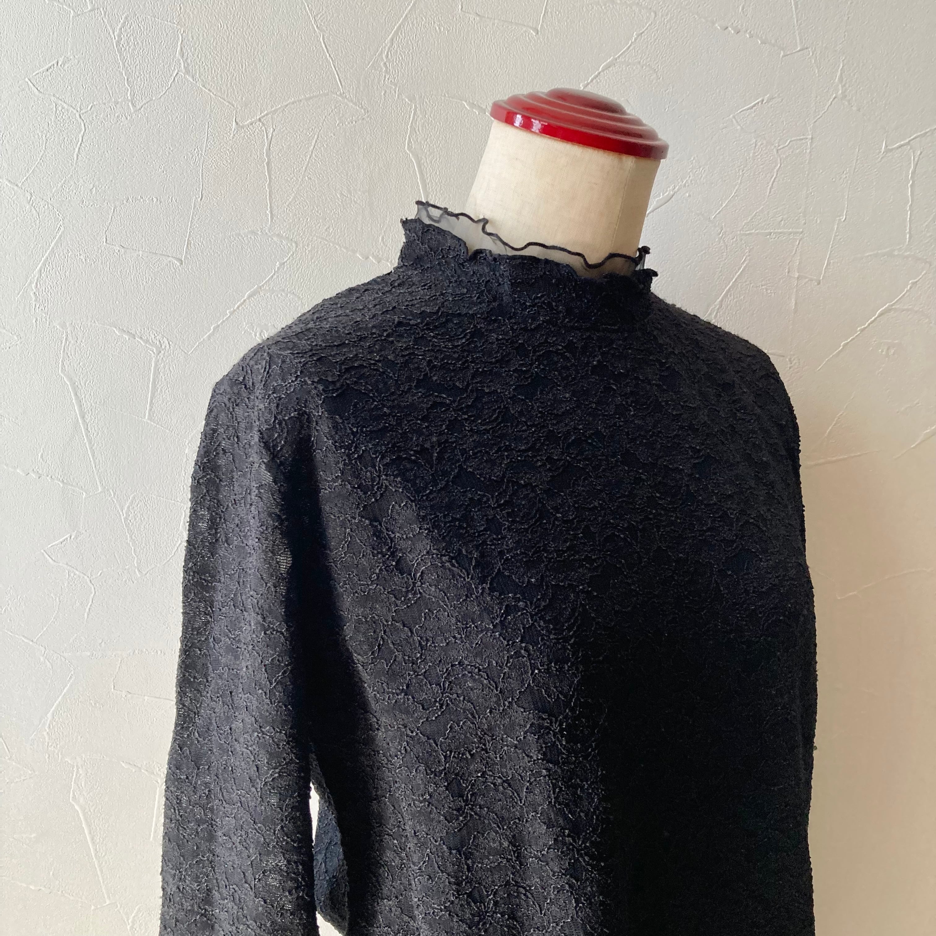 レース素材のトップス◯ 首のクシュクシュとシースルーが重ねられたデザインも可愛いです。